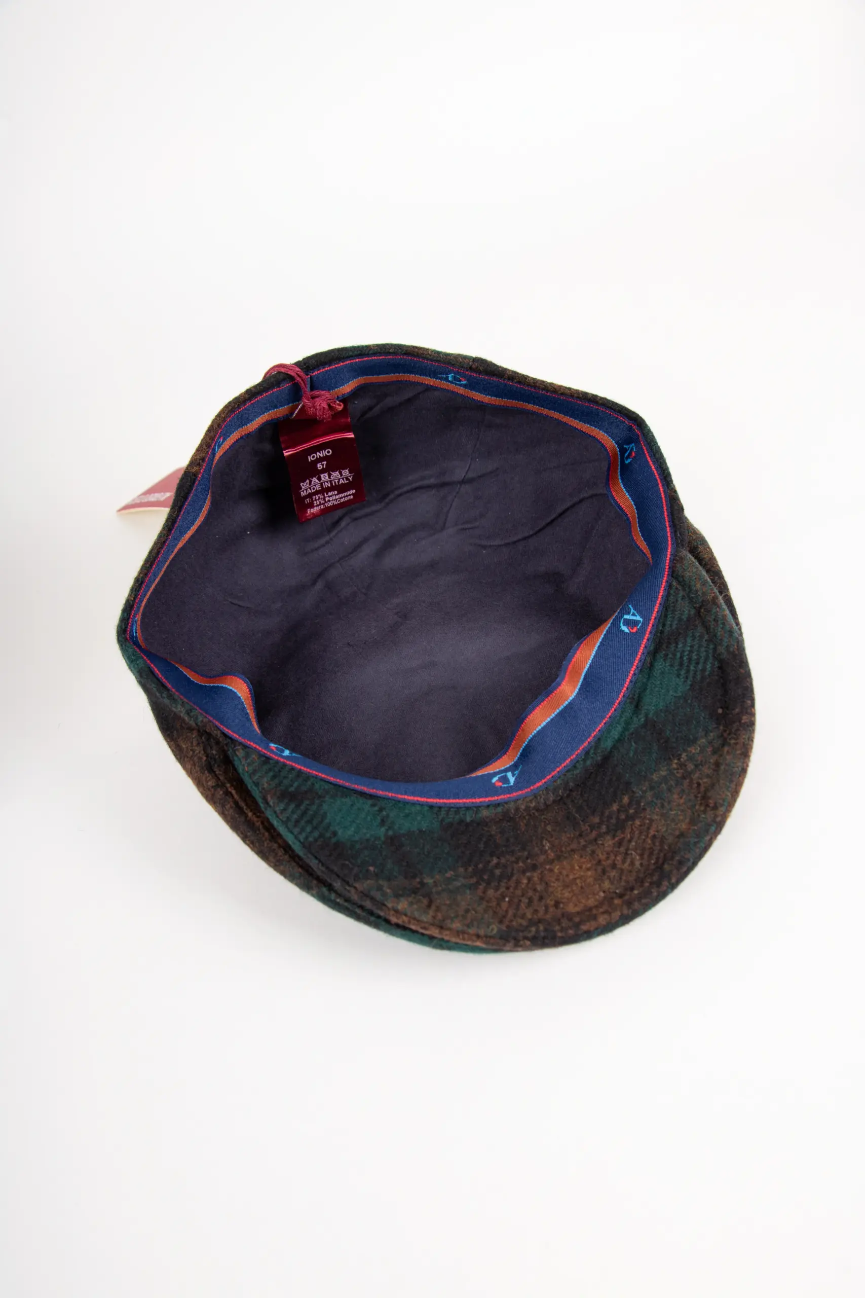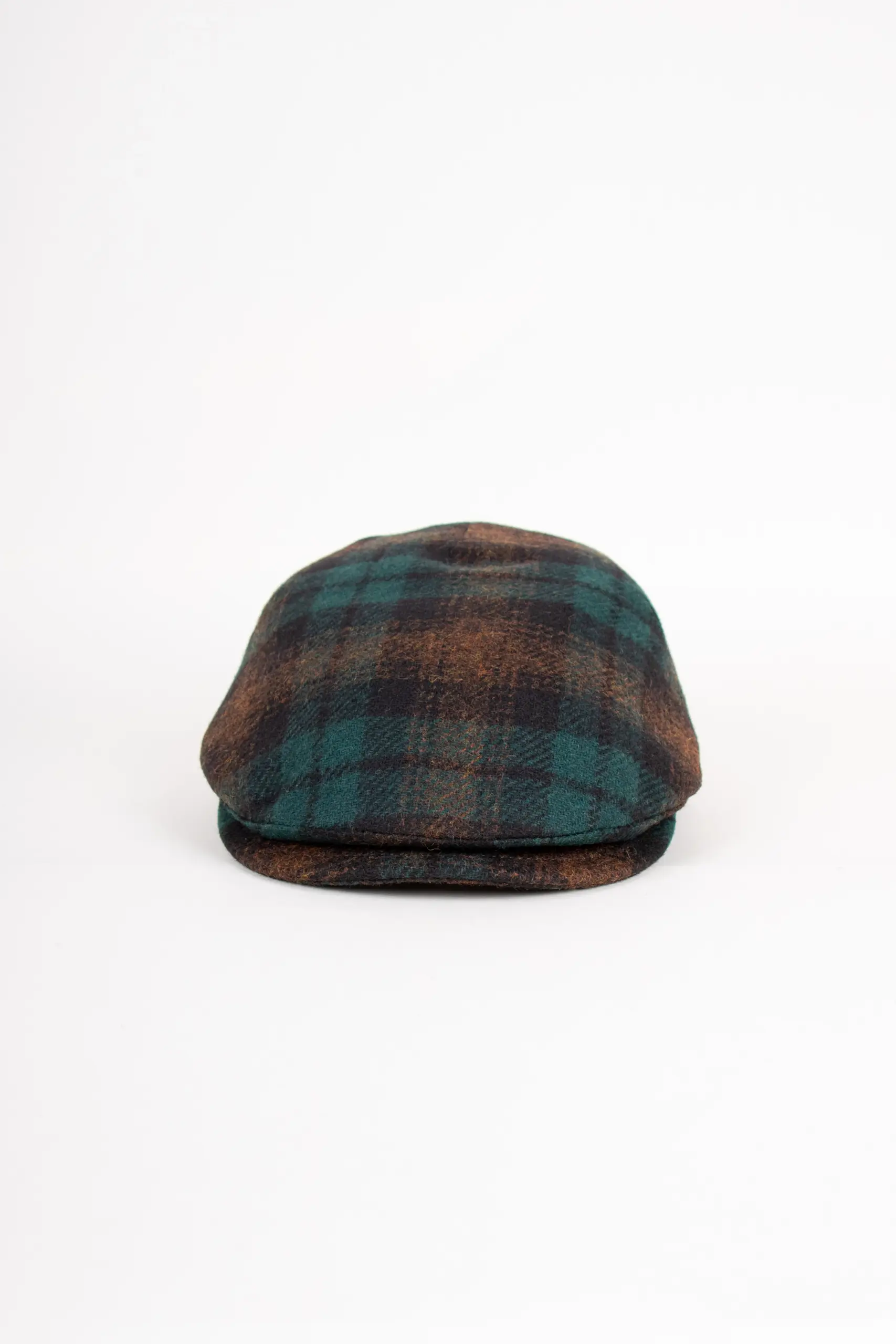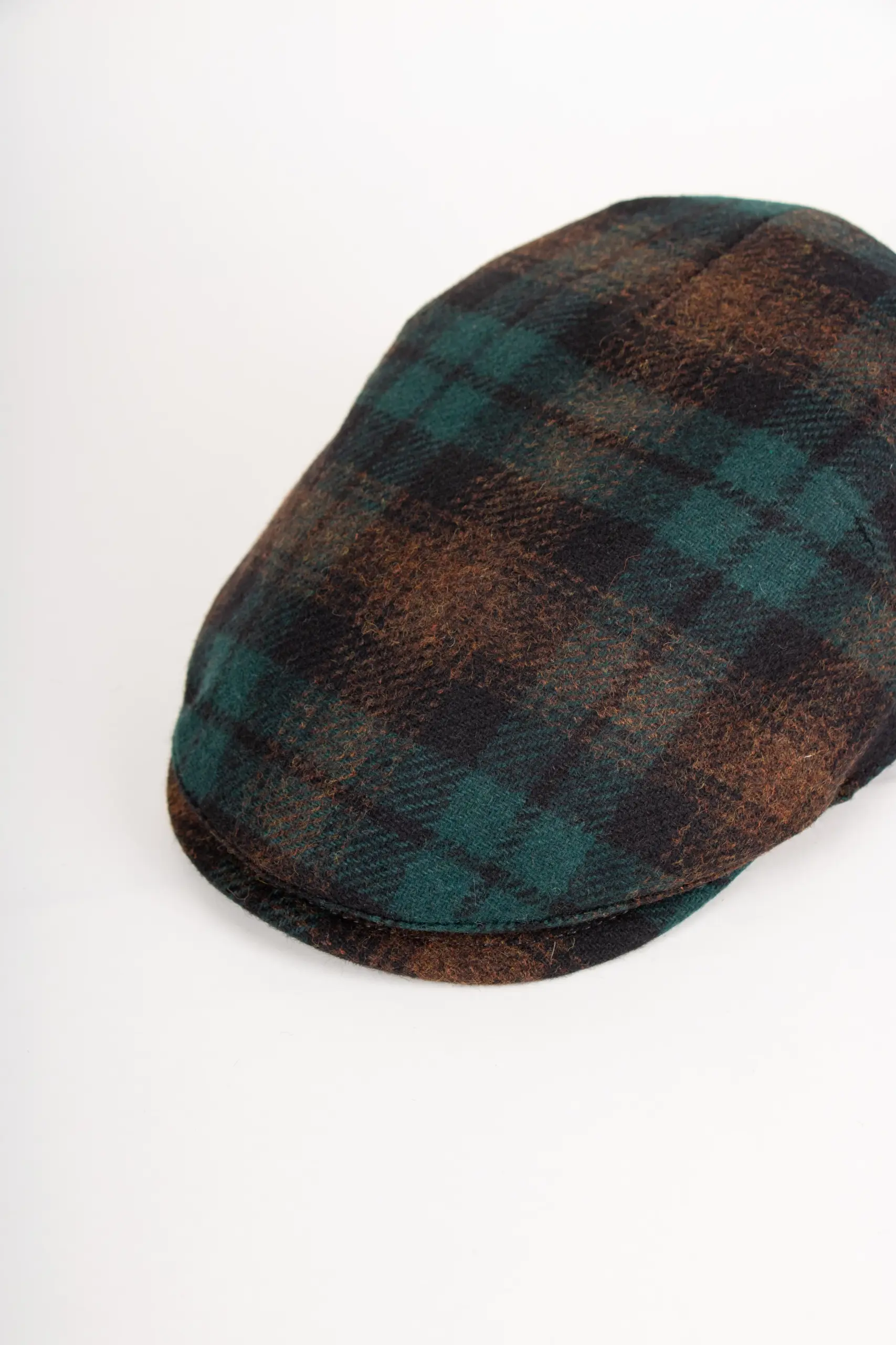 Material: 75% Wolle, 25% Polyamid Futter: 100% Baumwolle Farbe: Grün/Braun kariert Schirmlänge: ca. 5,5 cm