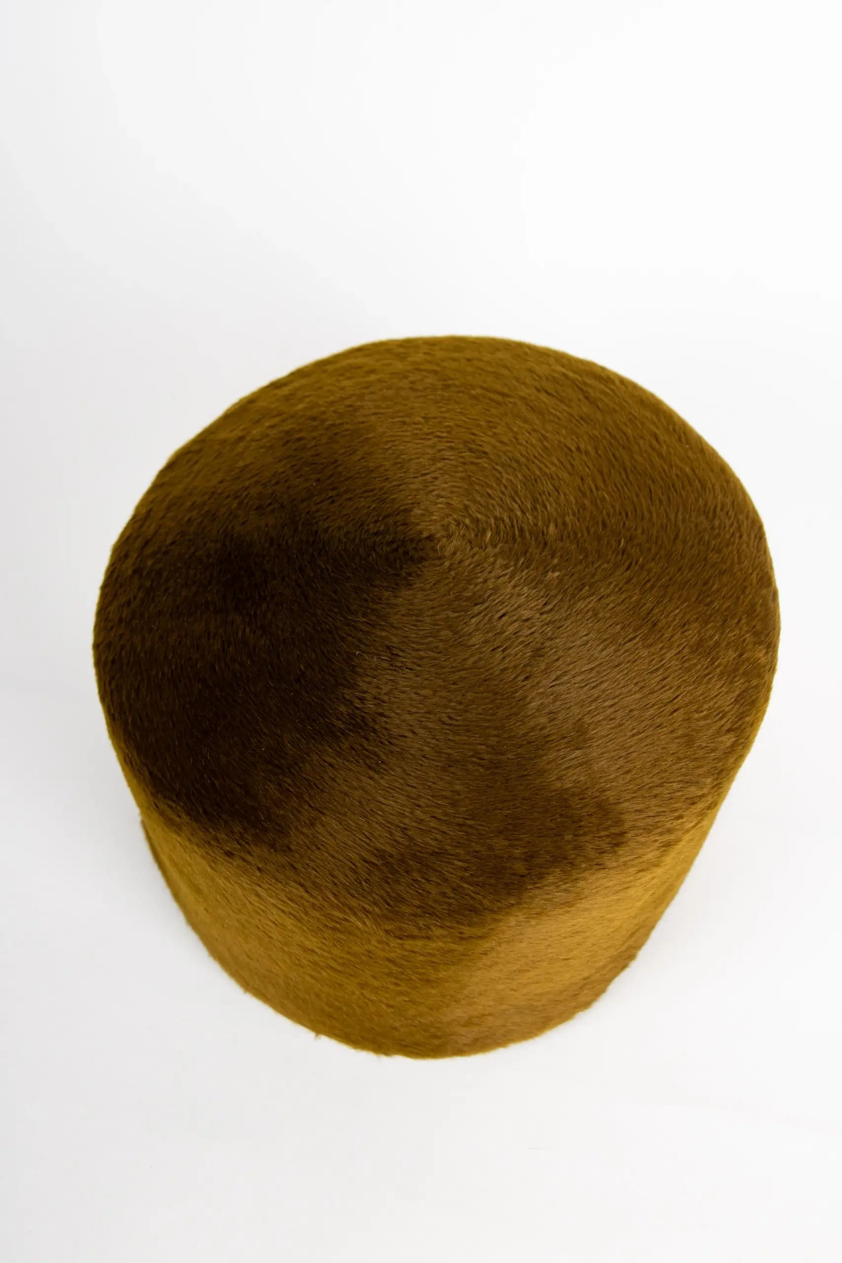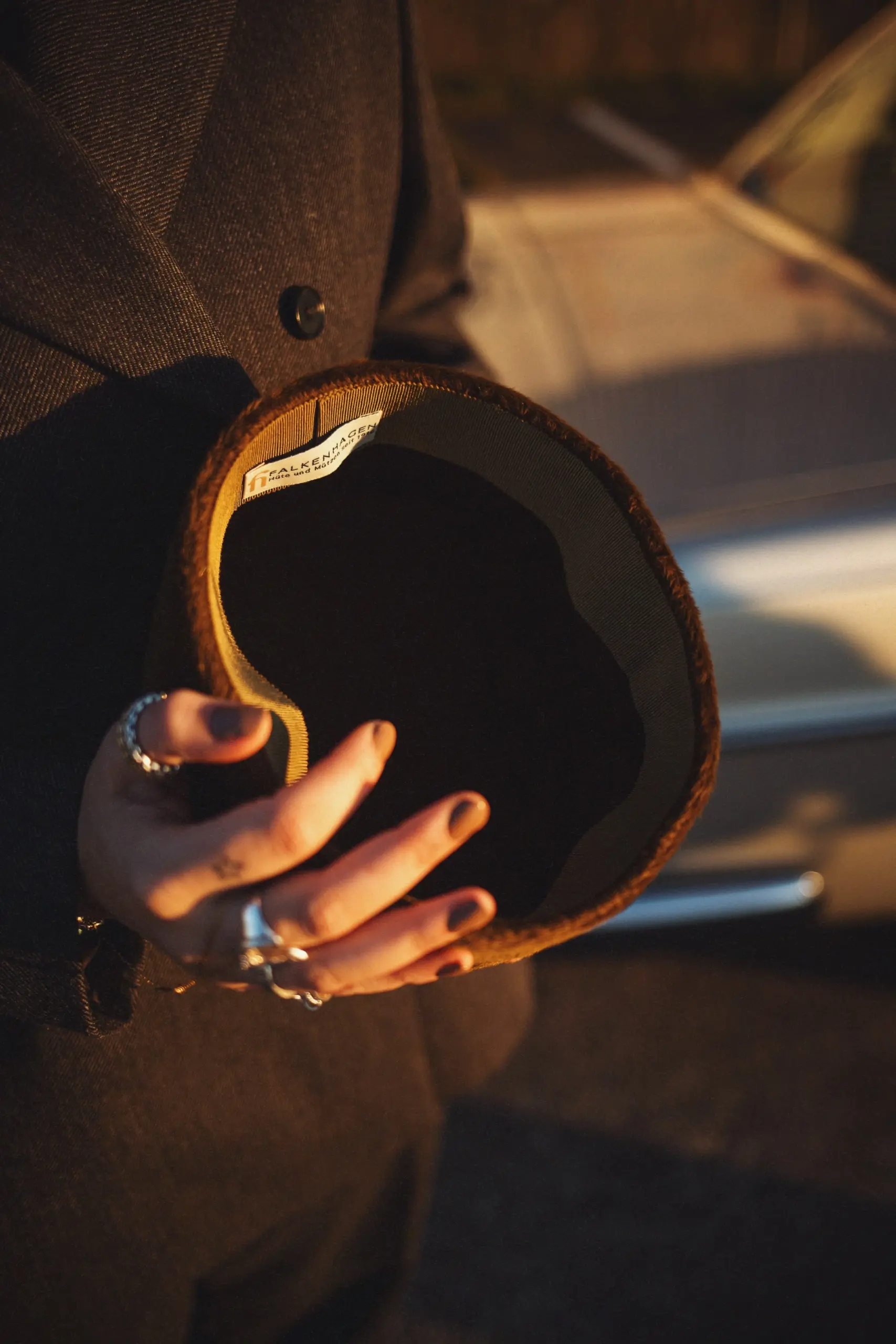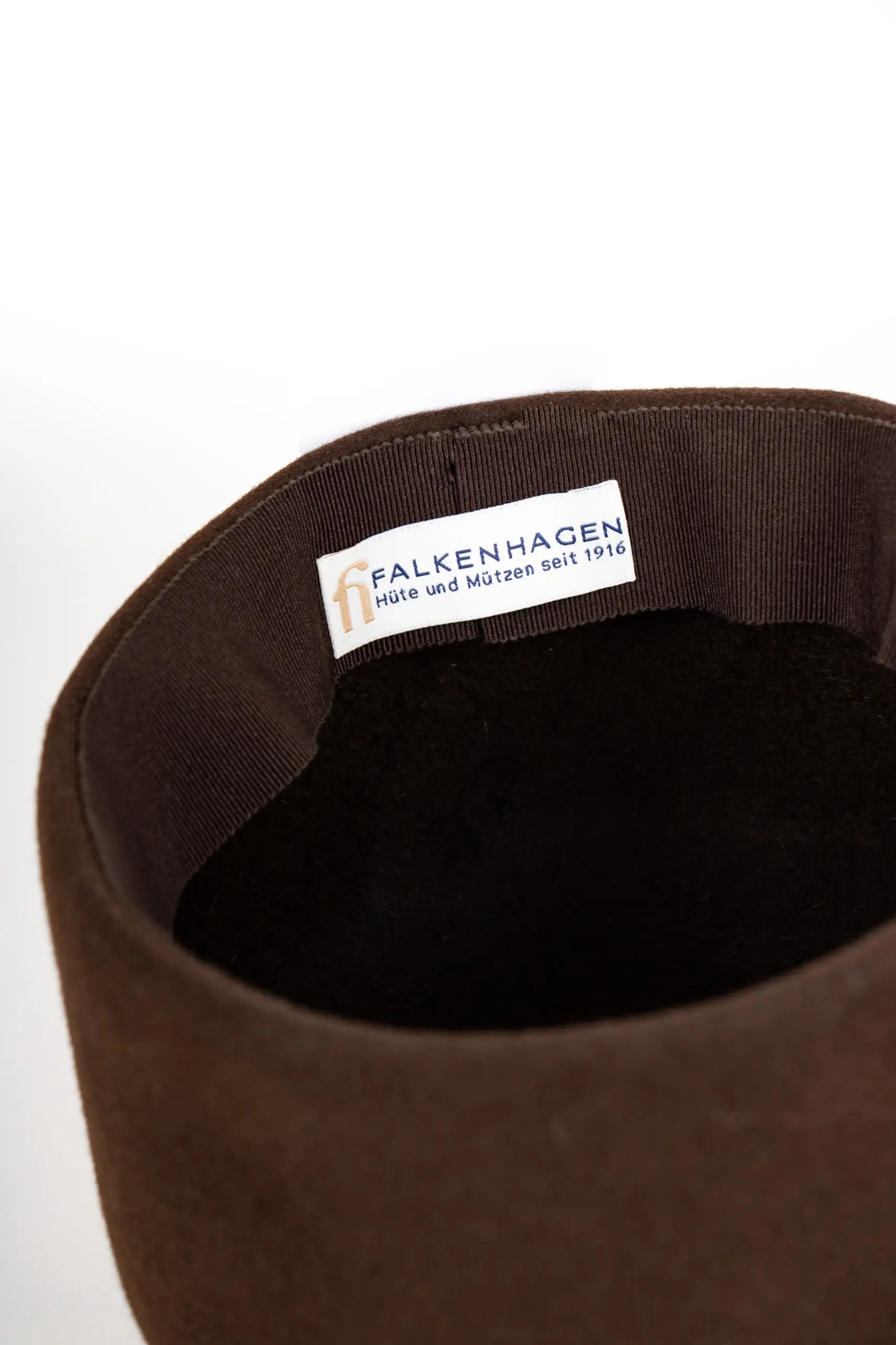 Die Atelier Falkenhagen Kleo ist eine Filzkappe für klare Linien und eine starke Haltung. Gefertigt aus feinem Haarfilz und ganz bewusst ohne Krempe, bewegt er sich zwischen Pillbox und Toque – reduziert, architektonisch und zeitlos. Die leicht trapezförmige Silhouette verleiht dem Modell Präsenz, ohne laut zu sein.