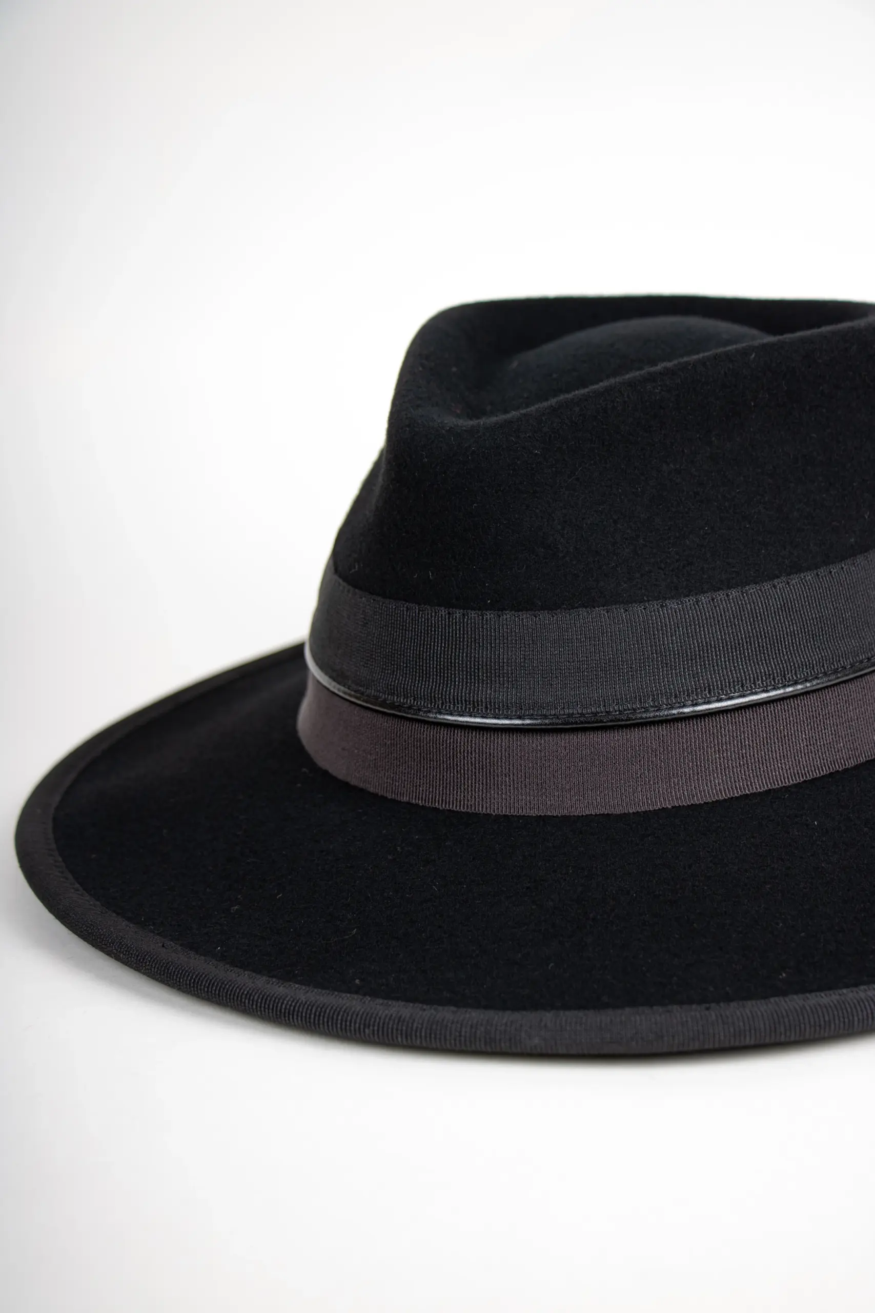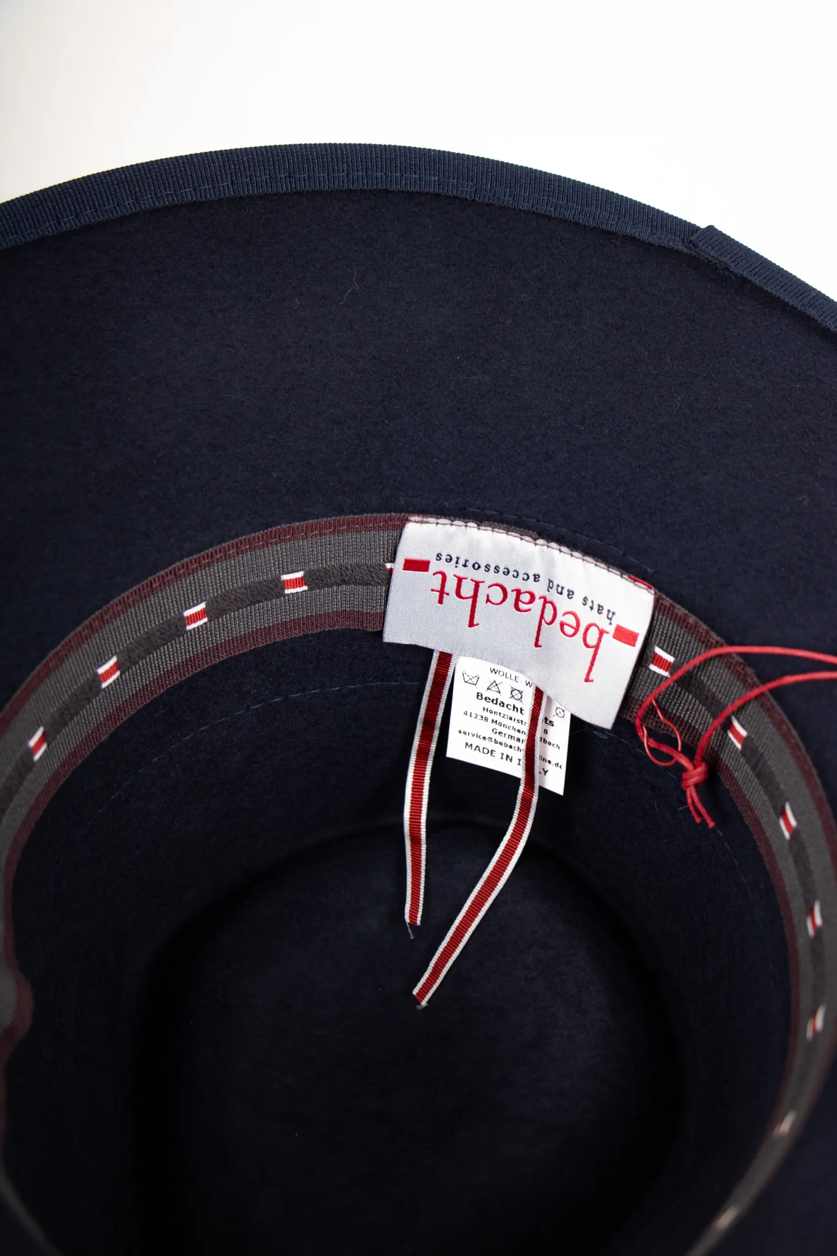 Das zweiteilige Dekoband, farblich harmonisch abgestimmt auf die Hutfarbe, bringt feine Kontraste ins Spiel, während der abgenähte Einfass am Krempenrand handwerkliche Präzision betont. Das Ergebnis: ein Fedora, der Tradition trägt, aber zeitgenössisch wirkt. Diesen Filzhut von Bedacht gibt es bei uns in Dunkelblau, Braun und Schwarz.