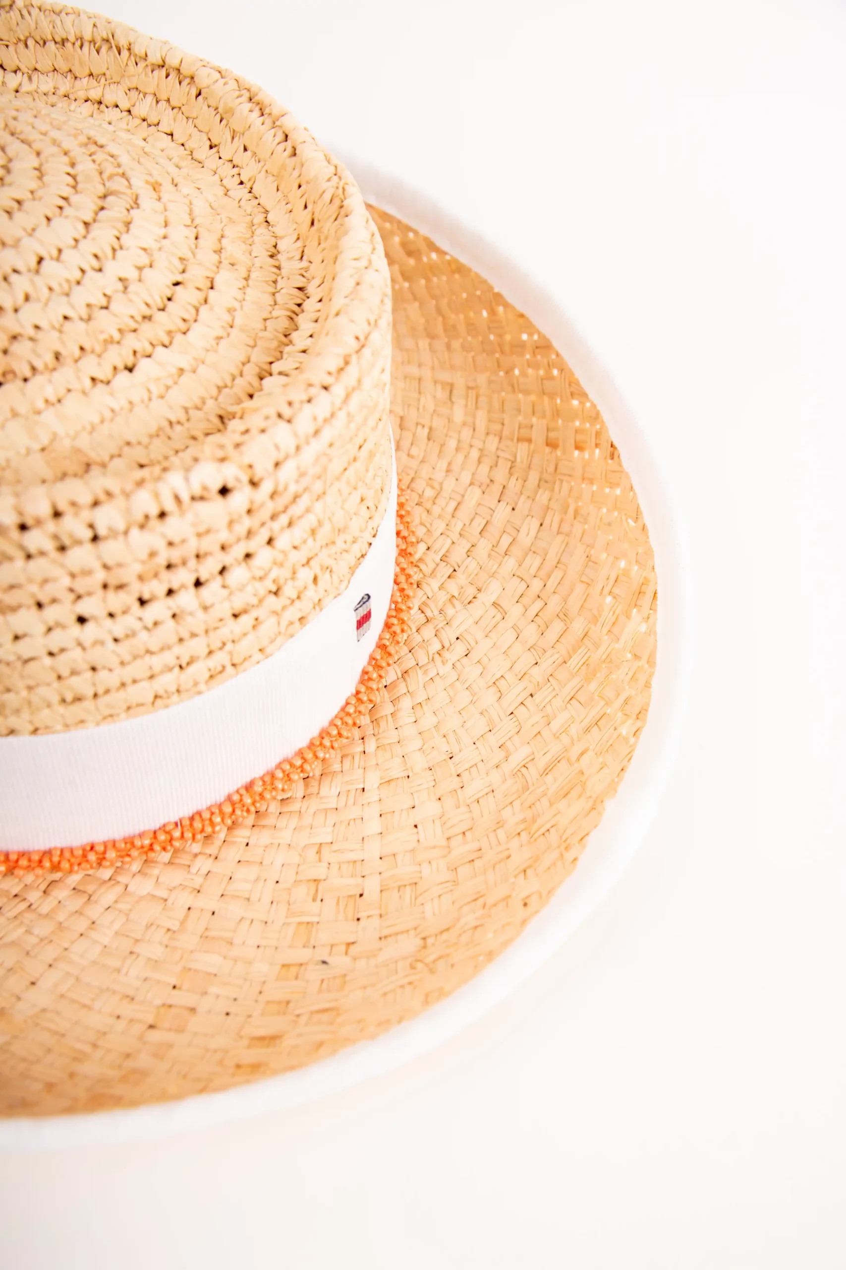 Material: 100% Raffia Stroh Farbe: Natur/Weiß Kopfhöhe: ca. 9,5 cm Randbreite: ca. 7 cm Größe: One Size ca. 57 cm