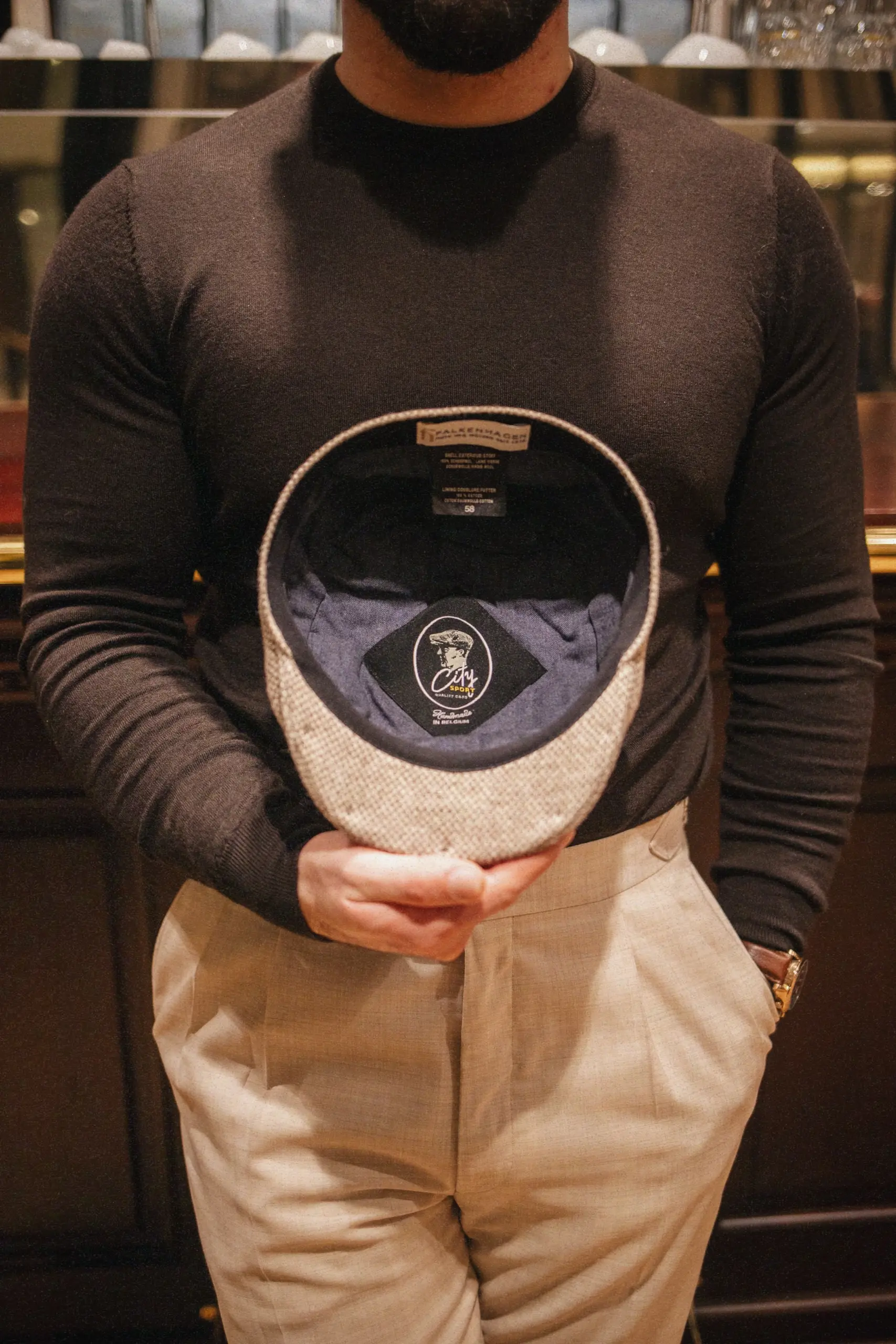 Nur feinste Fasern und jahrhundertealte Handwerkskunst schaffen diesen Stoff – ein Stück echter Kultur zum Tragen. Das Modell zeigt sich klassisch mit kurzem Schirm (ca. 4,5 cm) und einer bequemen Passform. Innen sorgt ein blaues Baumwollfutter für Komfort und Temperaturausgleich – ideal für Herbst und Winter.