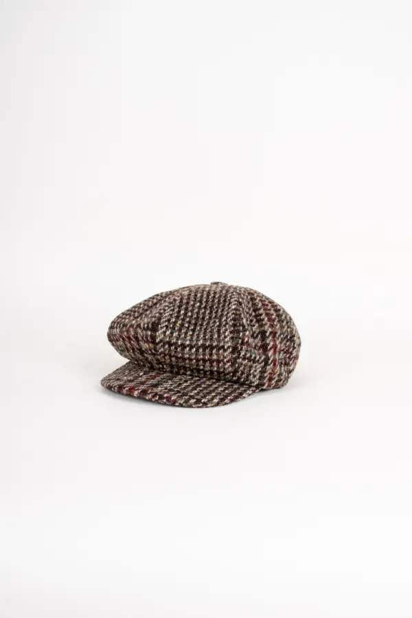 Material: 100% Wolle Futter: 100% Baumwolle Farbe: Braun-Oliv-Beige-Terracotta gewebt Schirmlänge: ca. 6 cm Form: Ballonmütze, 8-teilig