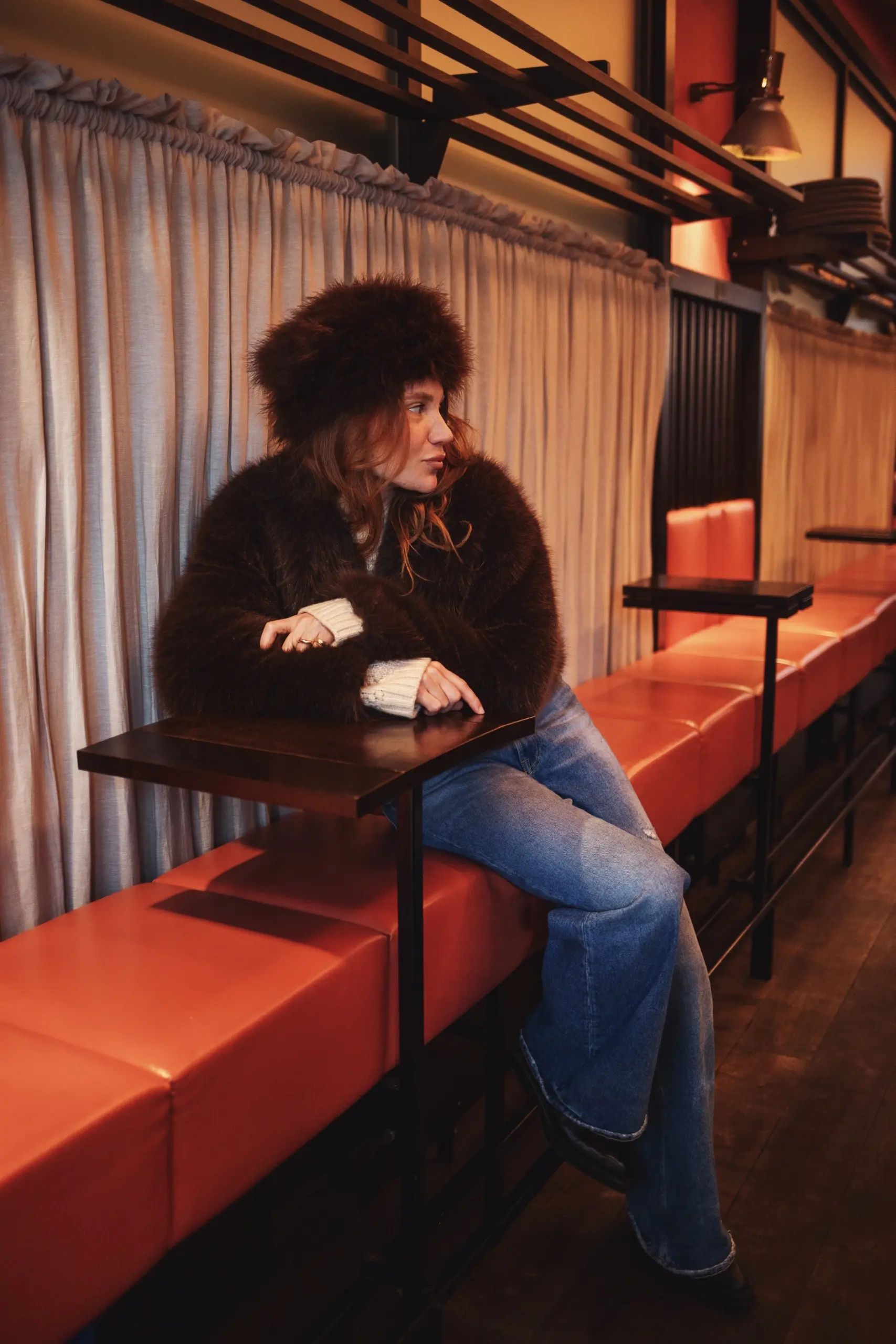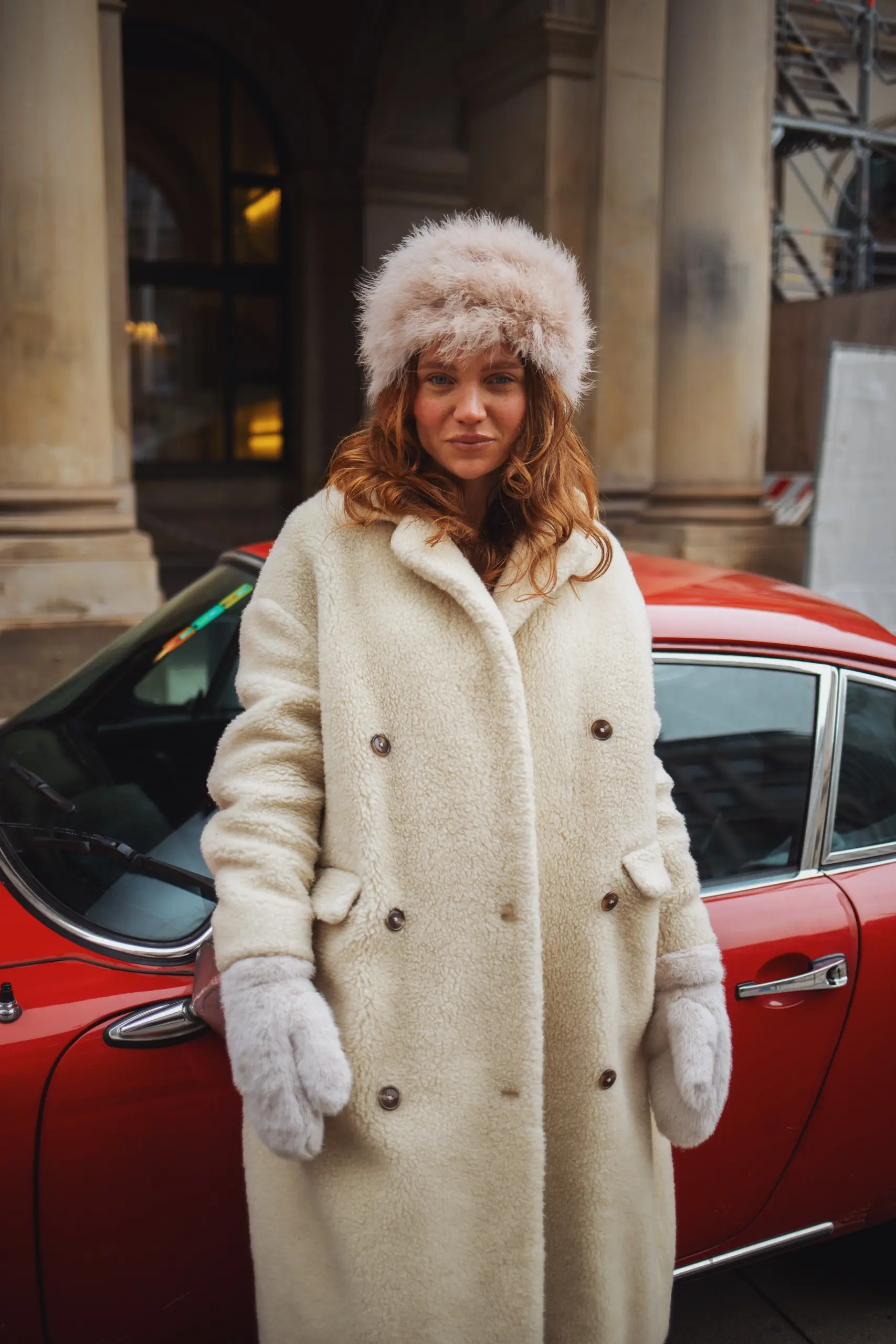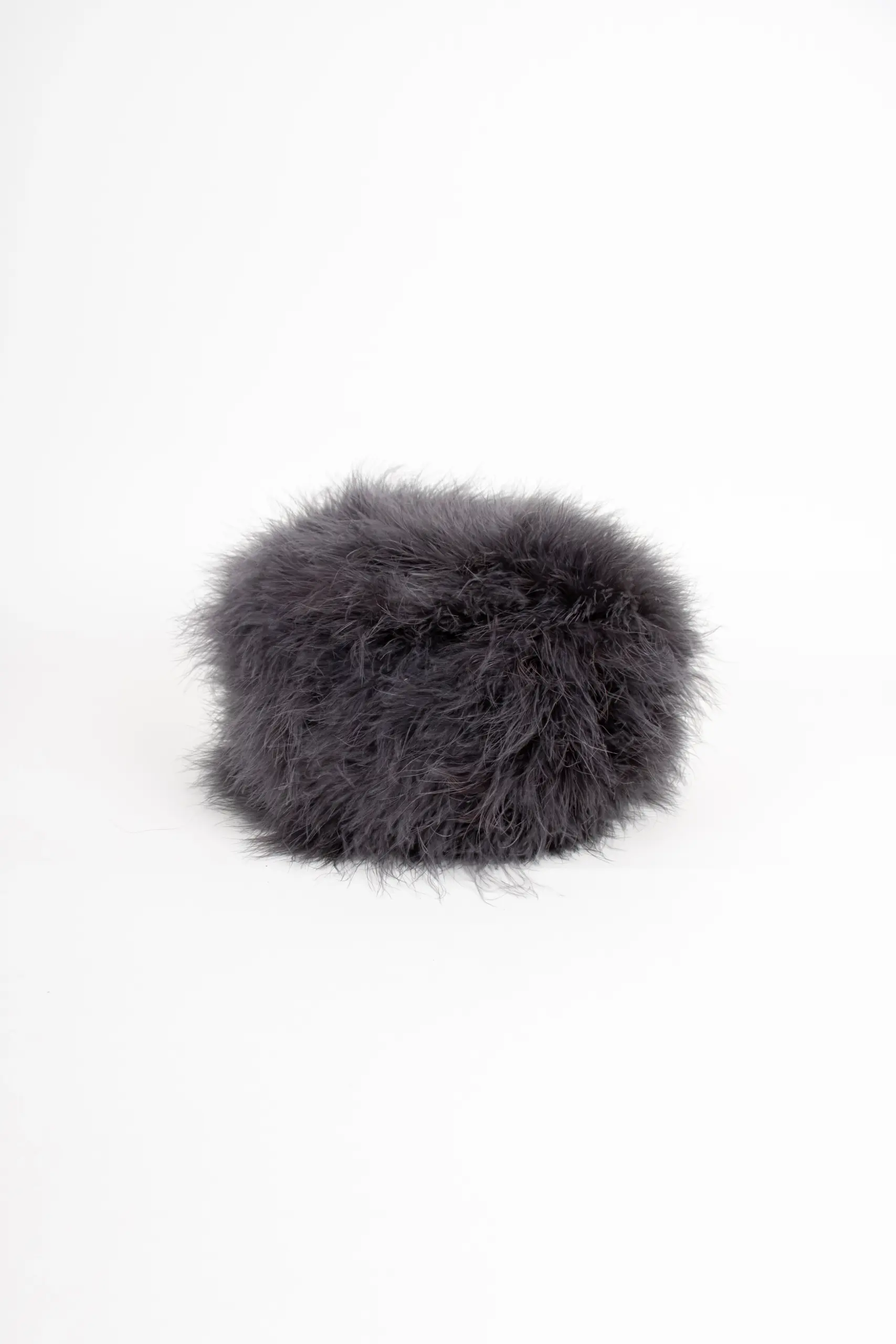 Feder für Feder von Hand gesetzt, entstand eine Toque, die laut ist und auffällt. Die zarten Truthahnfedern bewegen sich mit jeder Geste, fast wie ein leiser Flügelschlag – ein Hauch Couture, getragen mit Gelassenheit.
