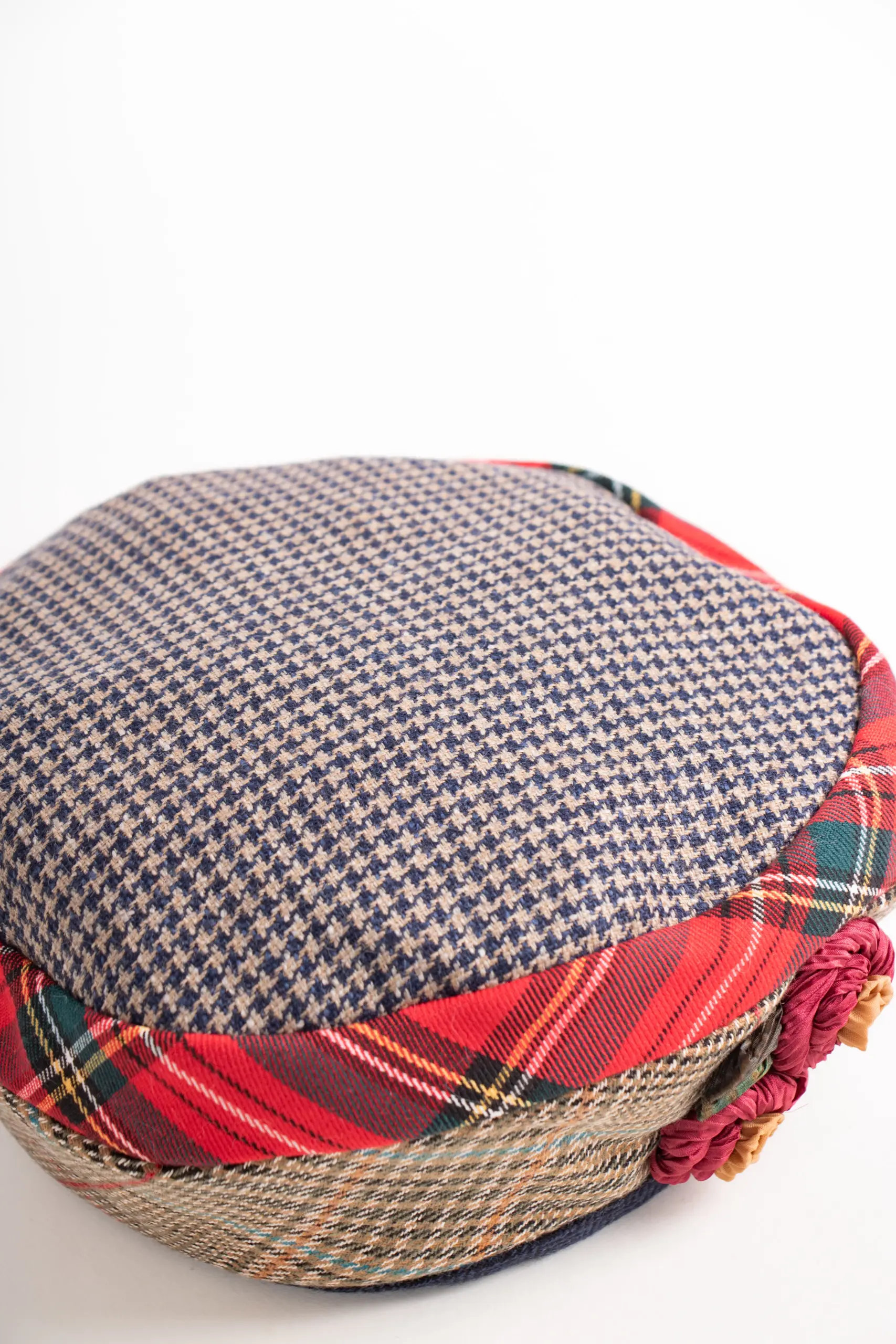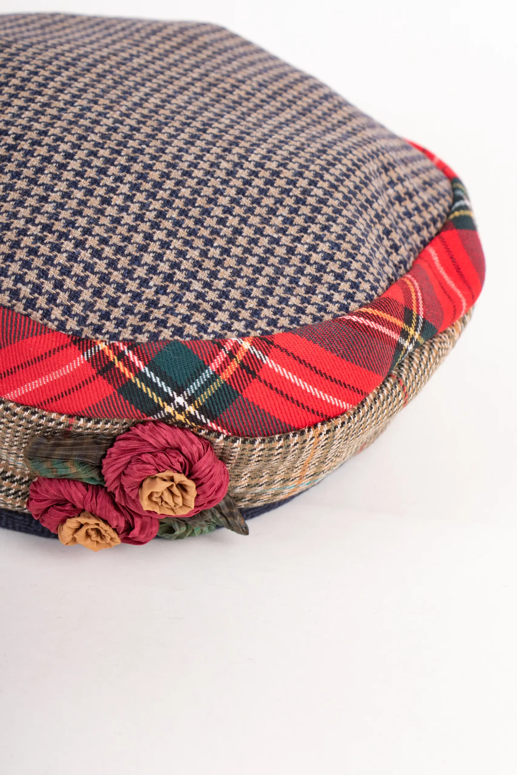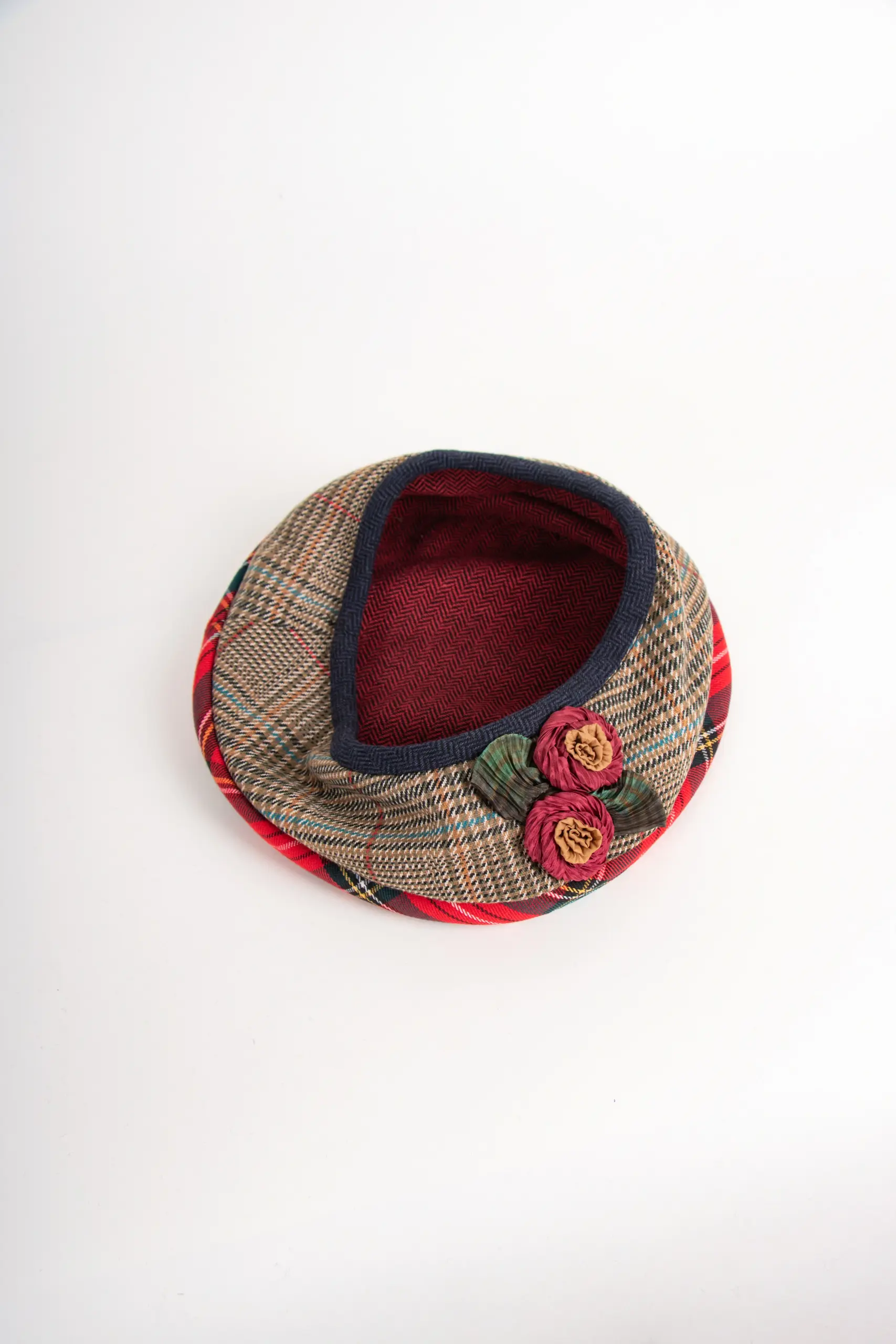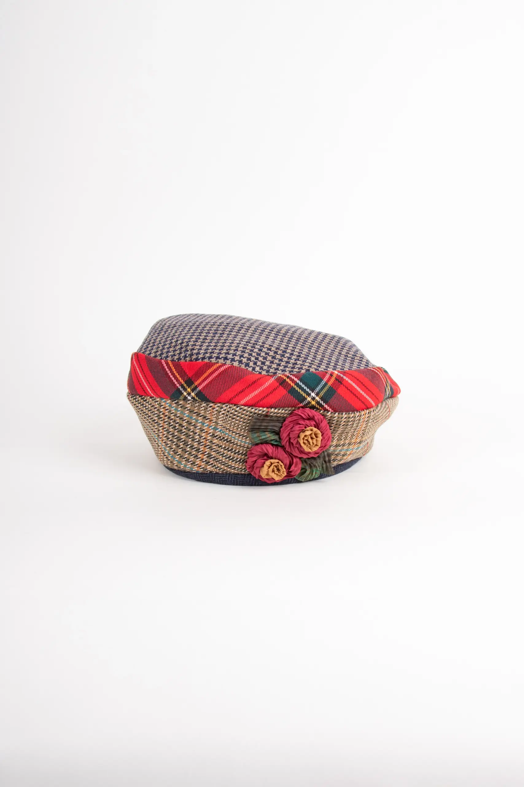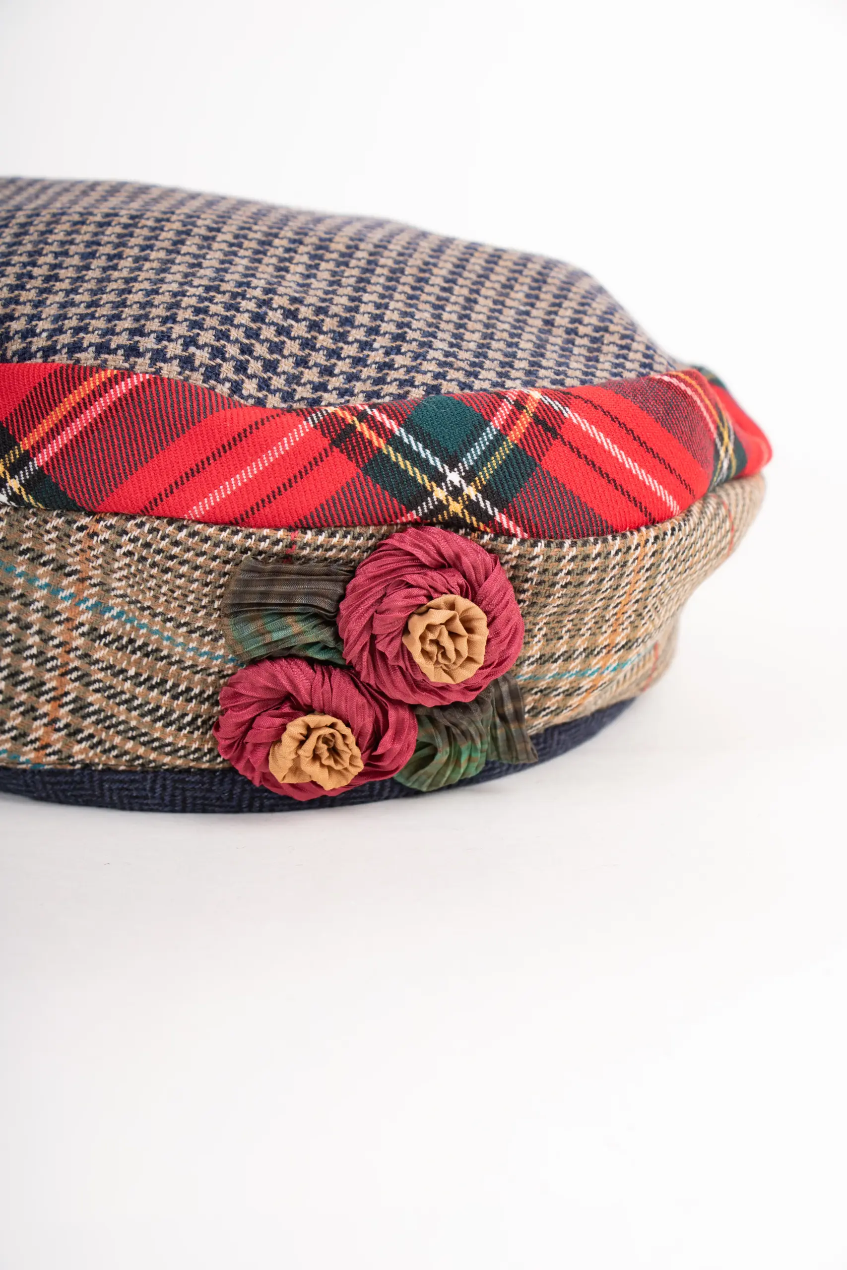 Das Patchwork-Karomuster in Rot, Braun, Navy und Grün verleiht der Mütze einen charaktervollen Look, während die applizierten Blüten eine zarte, feminine Note setzen. Das Ergebnis ist ein Design, das gleichzeitig kreativ, stilvoll und mühelos tragbar ist.