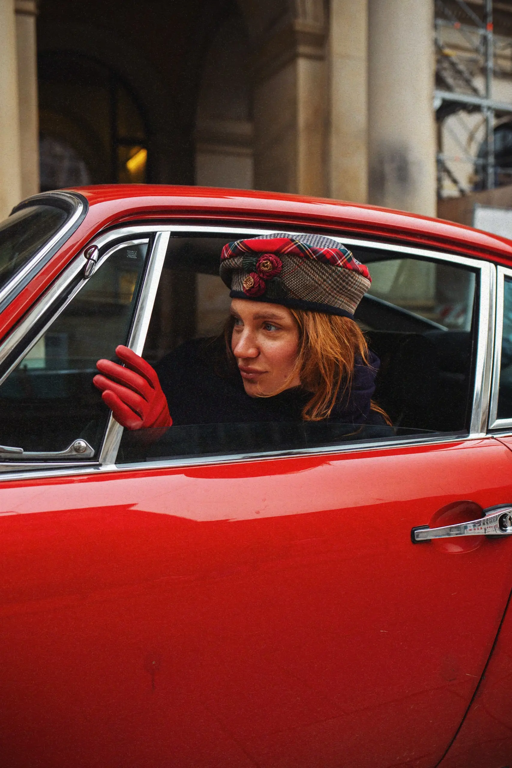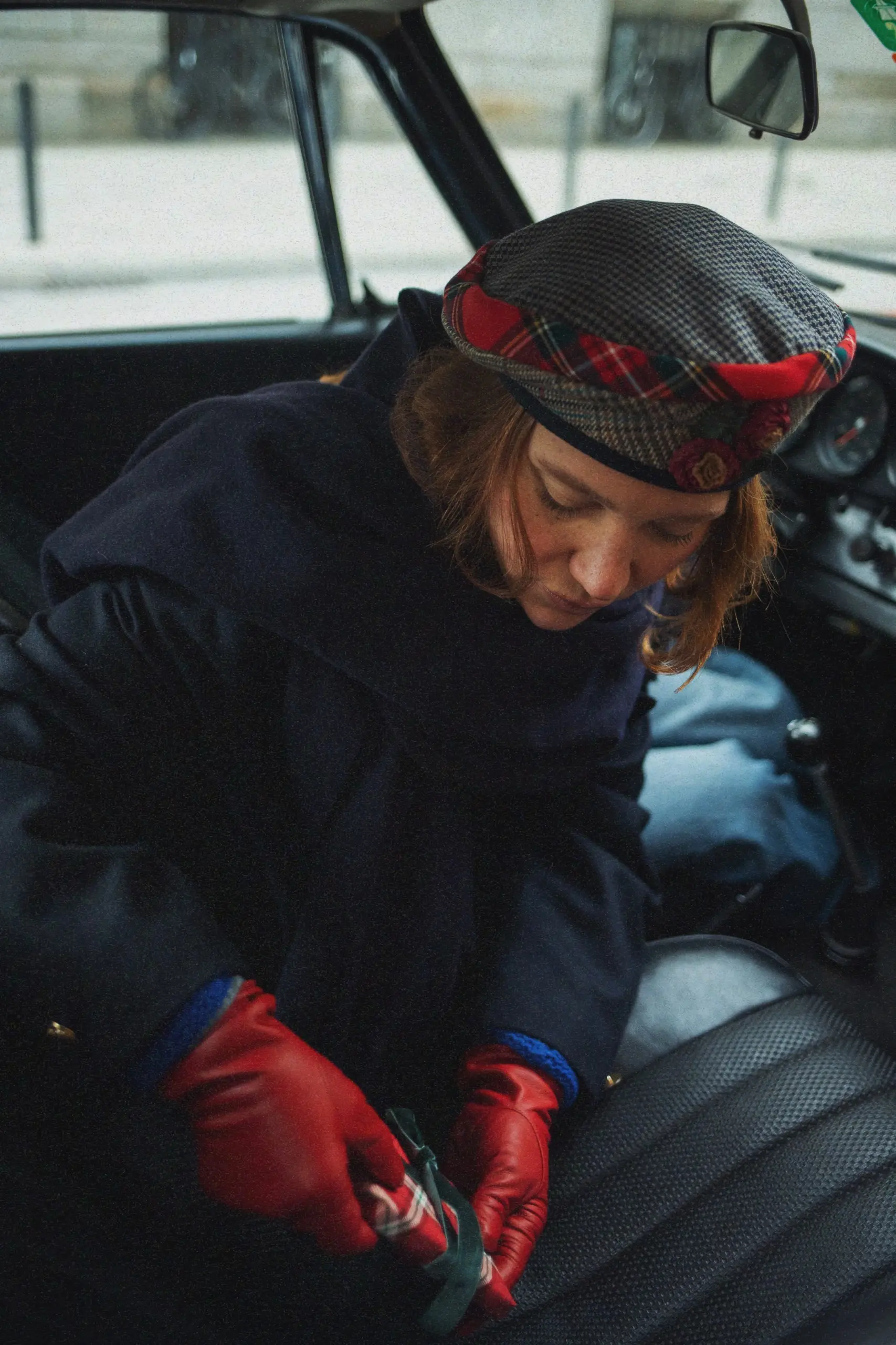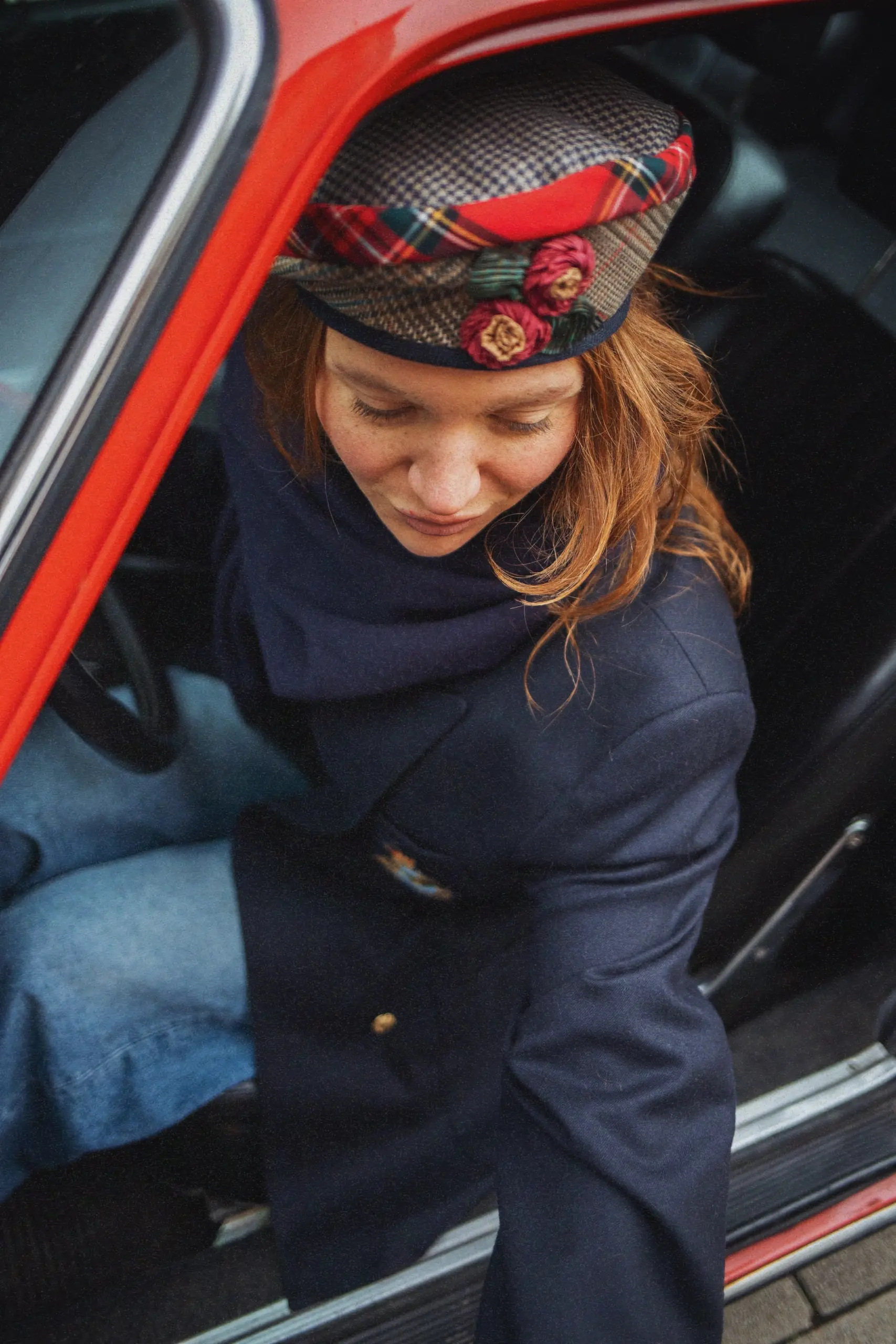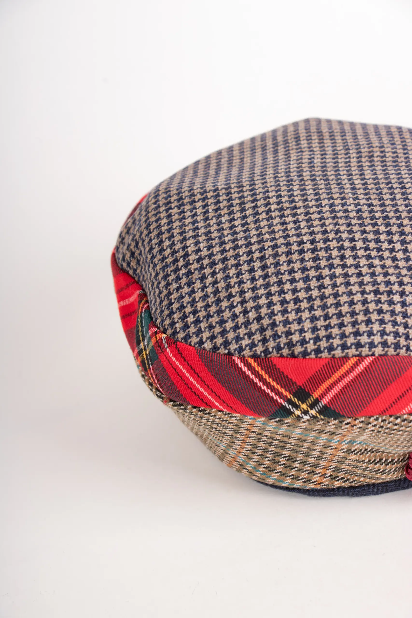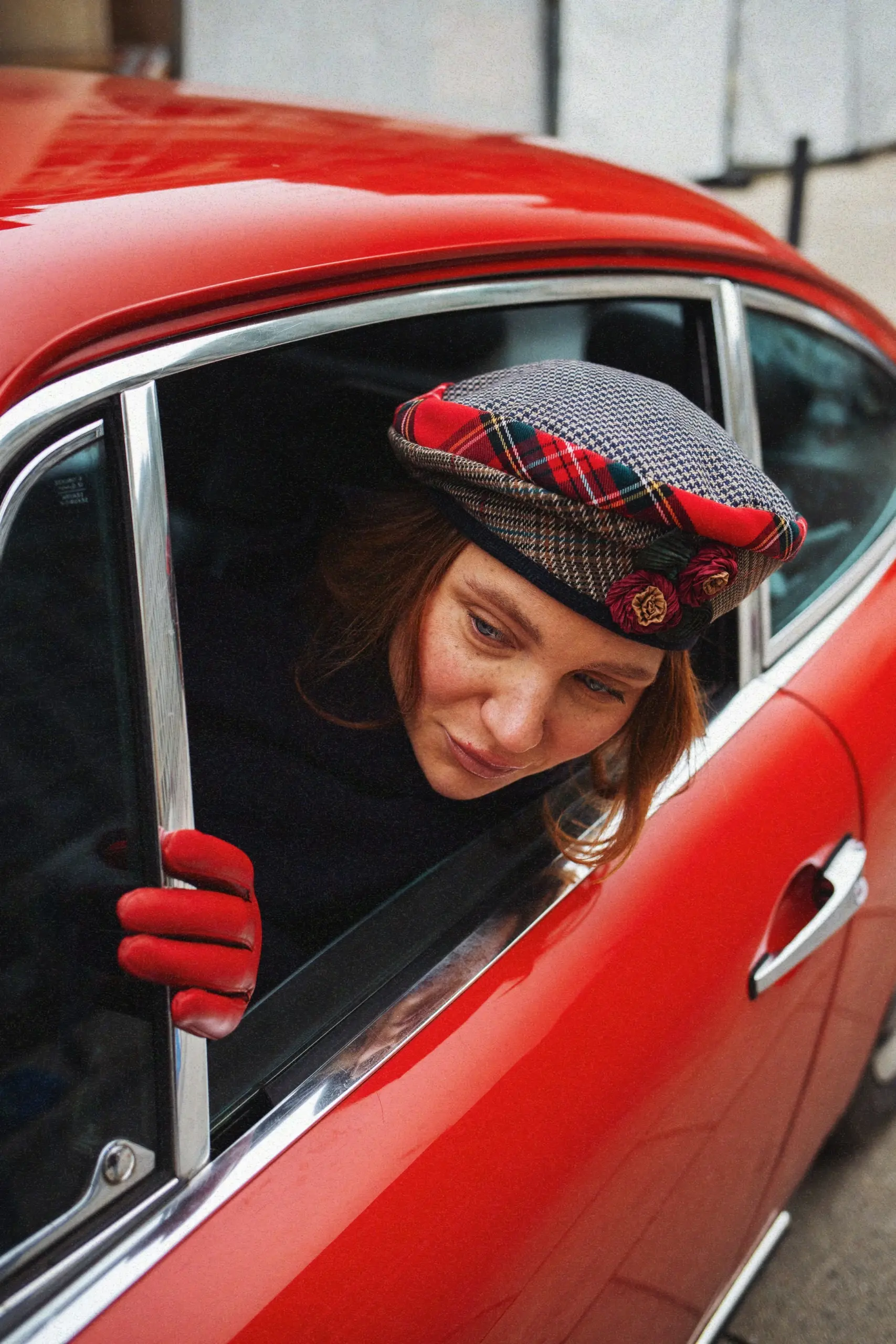 Das Patchwork-Karomuster in Rot, Braun, Navy und Grün verleiht der Mütze einen charaktervollen Look, während die applizierten Blüten eine zarte, feminine Note setzen. Das Ergebnis ist ein Design, das gleichzeitig kreativ, stilvoll und mühelos tragbar ist.