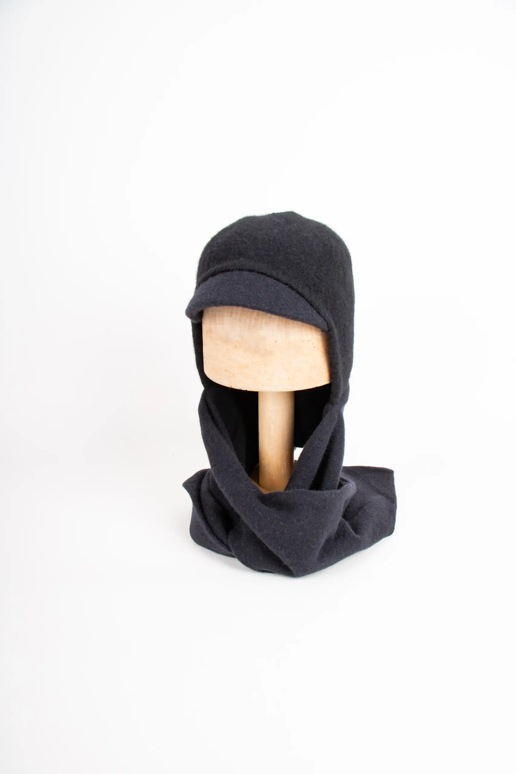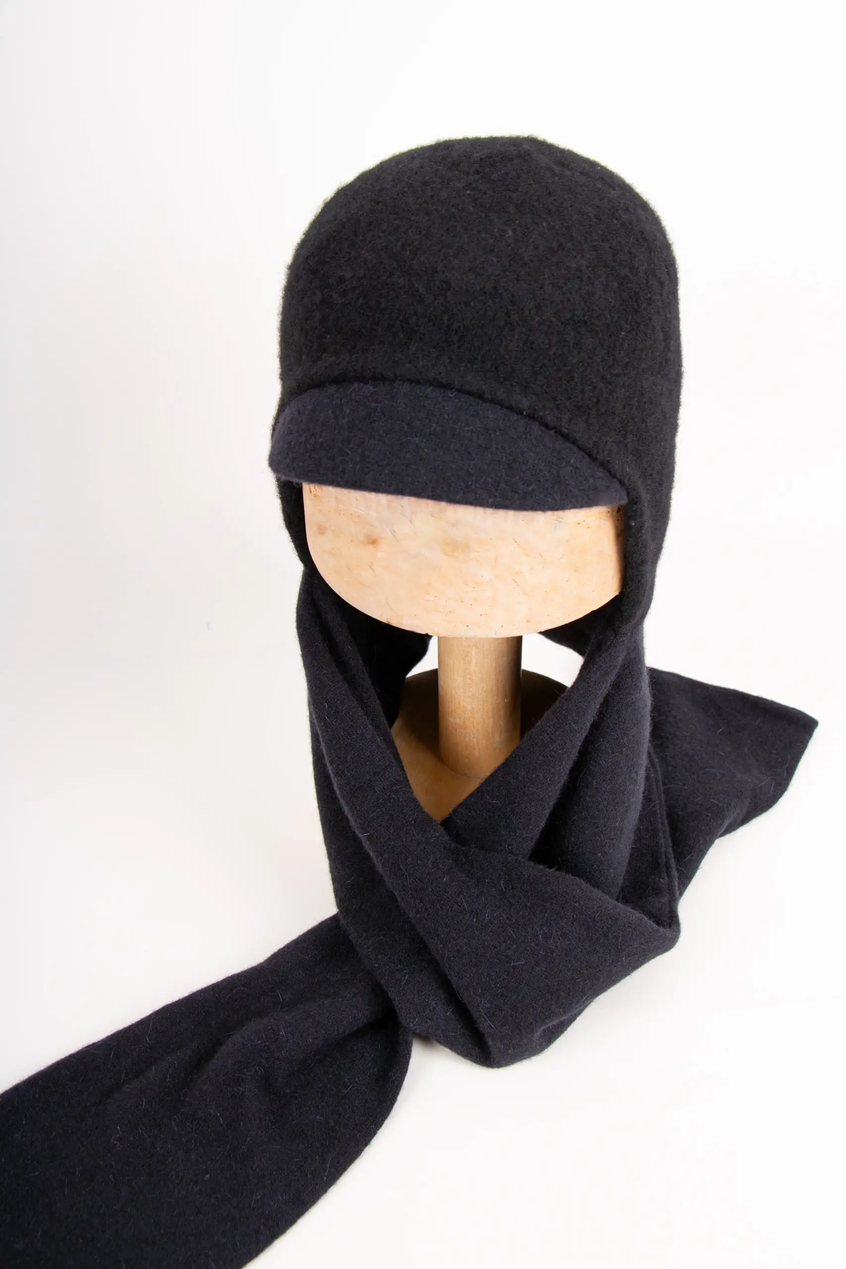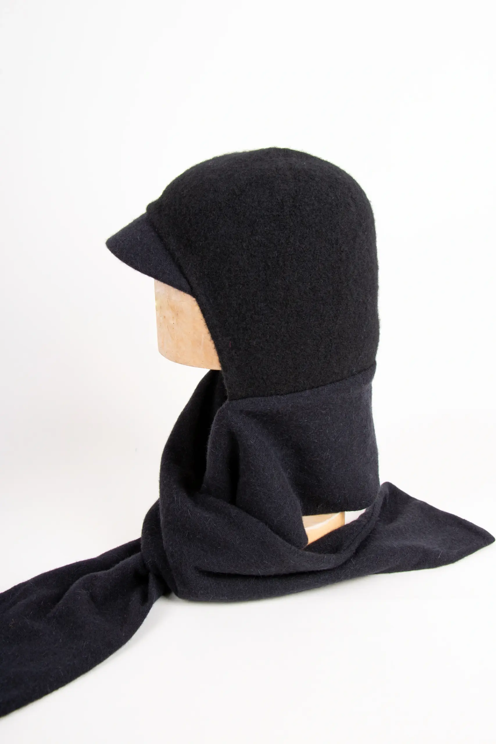 Der integrierte Schal schafft eine elegante, balaclava-ähnliche Silhouette, die Wärme und Stil verbindet. Der weiche Strickstoff legt sich angenehm um Kopf und Hals, während der Filzschirm für Struktur und Charakter sorgt.