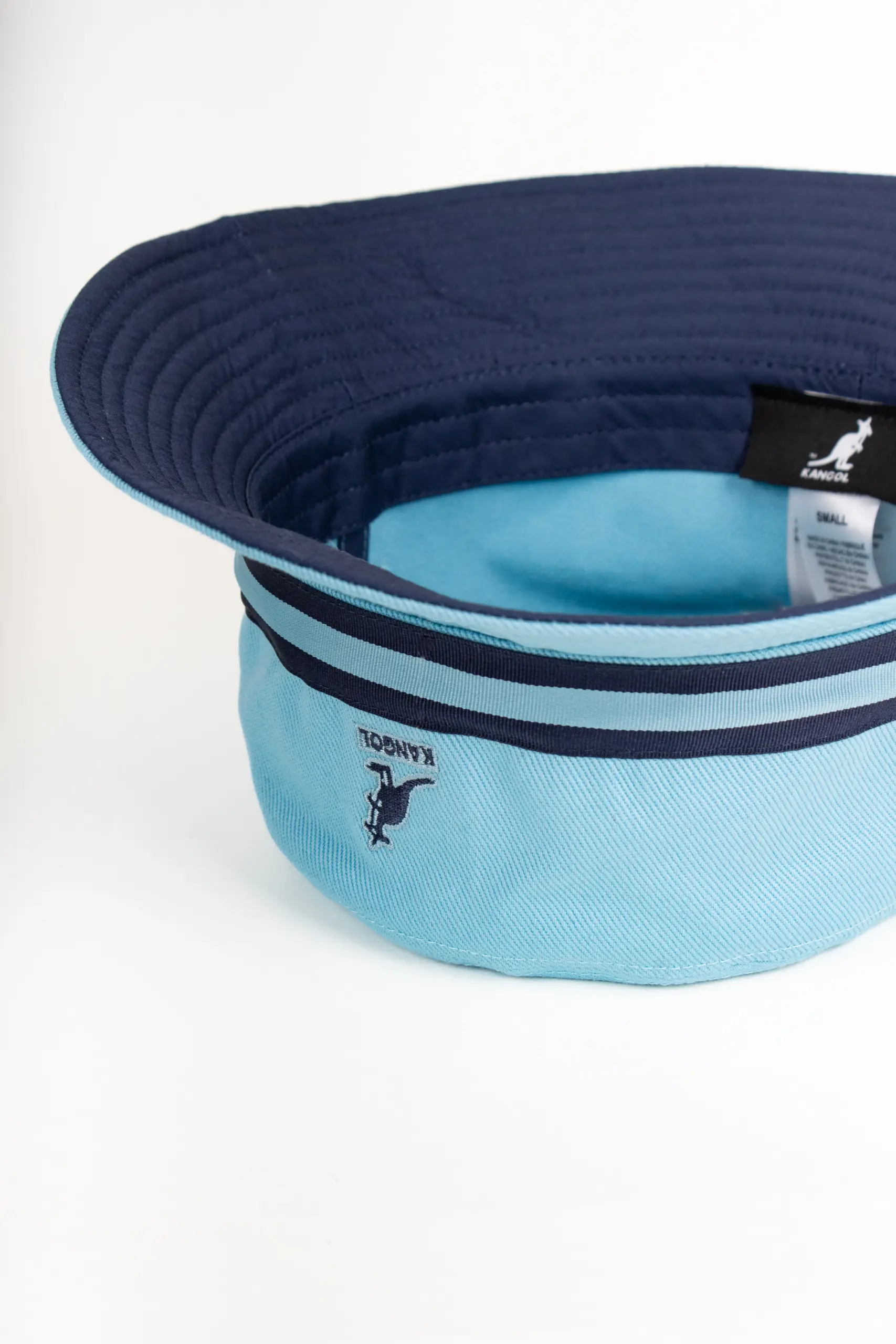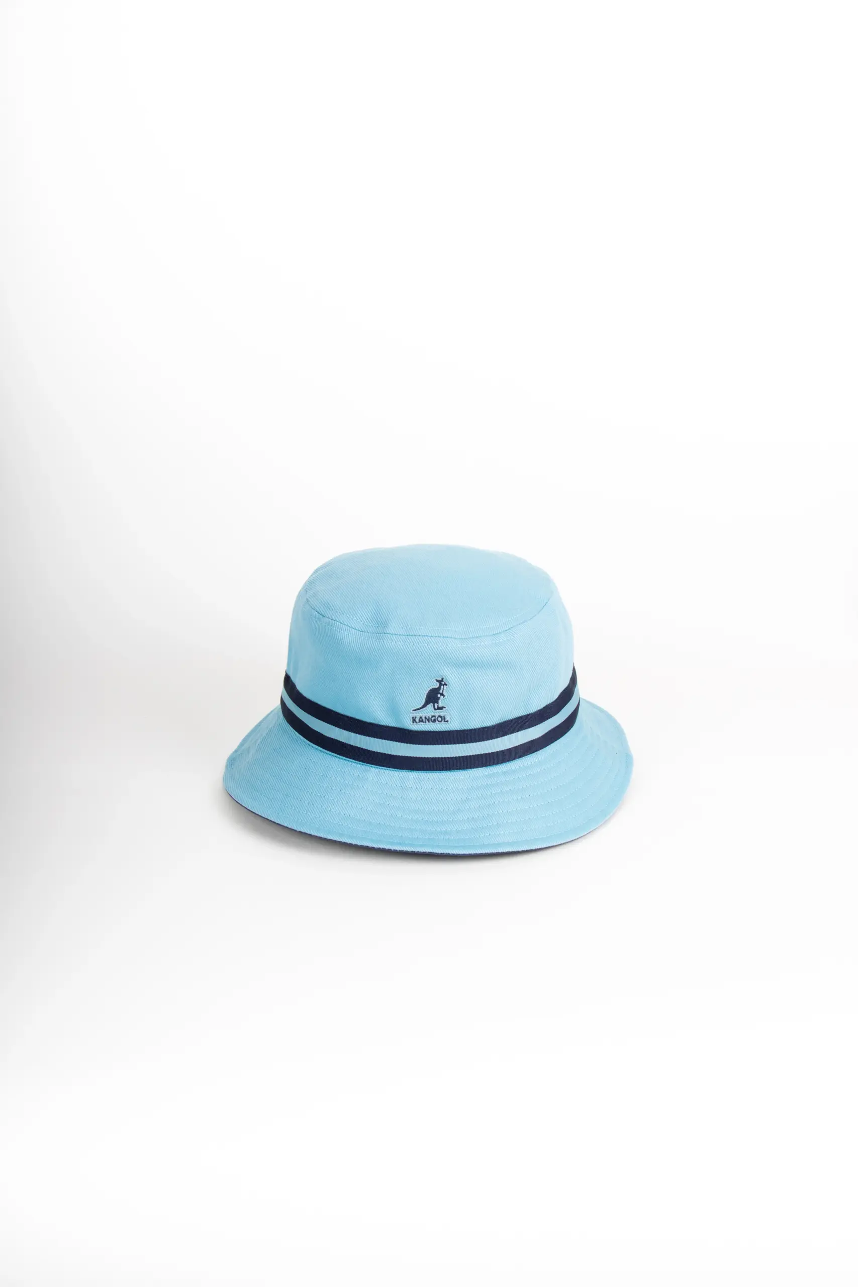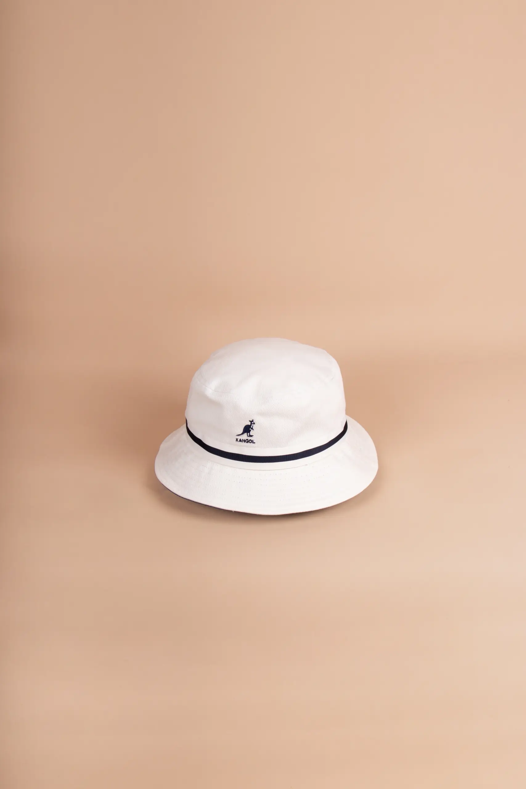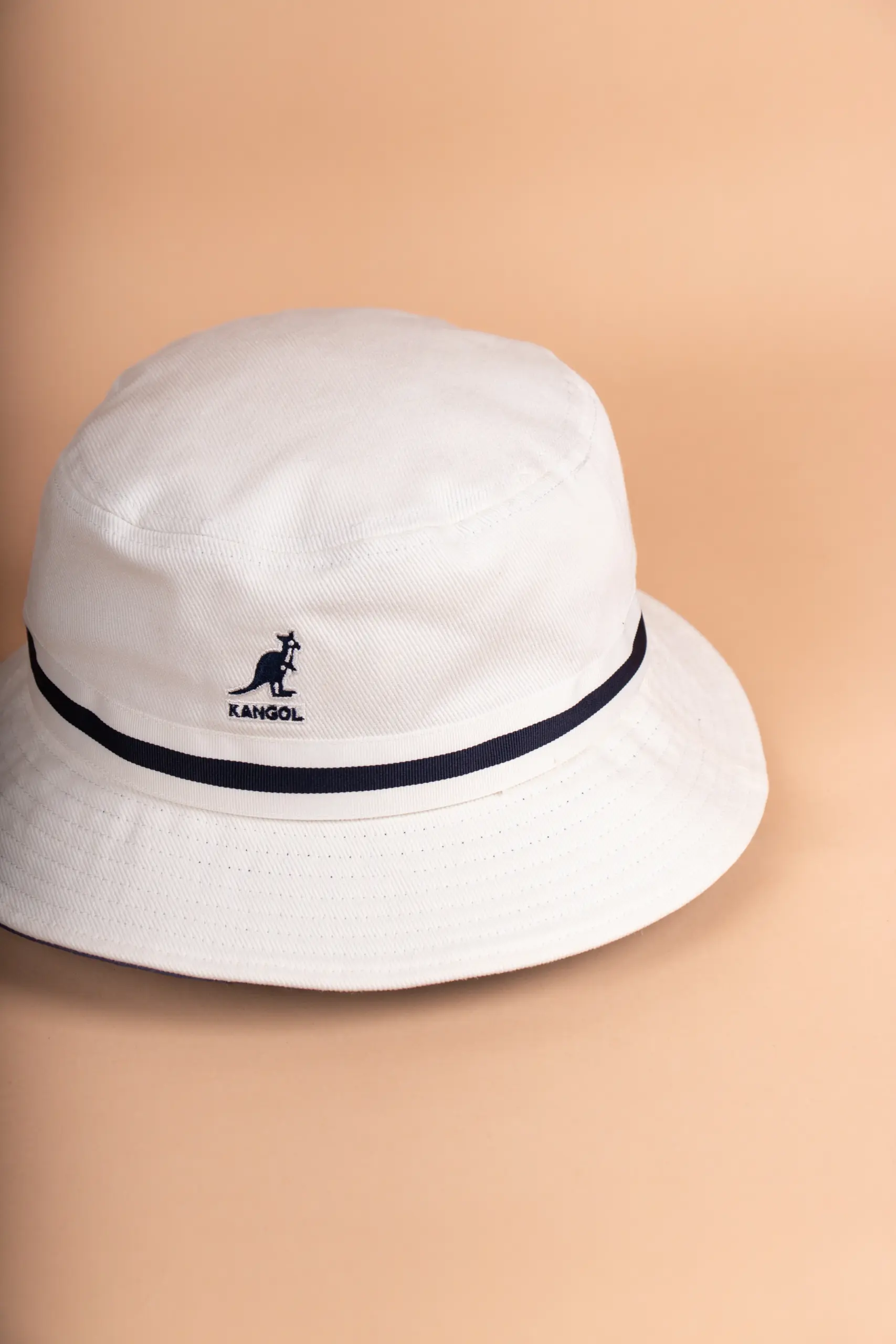 Streifen über der Krempe – kleines Detail für Vintage Vintage Bucket Hat. Das, was den Stripe Lahinch von allen anderen Bucket Hats unterscheidet, ist das zweifarbige Band, das sich um die Krempe wickelt. Streifen in Kombination mit dunkelblauen Elementen – egal welche der drei Farbvarianten Sie bei uns wählen, Navy ist immer mit am Hut dabei. Das gibt dem Hut Struktur, Charakter, und diesen leicht nautischen Vibe, der irgendwie immer funktioniert. Über den Streifen, an der Vorderseite, sitzt das klassische Kangol-Känguru-Logo – klein, gestickt, erkennbar für alle, die wissen.