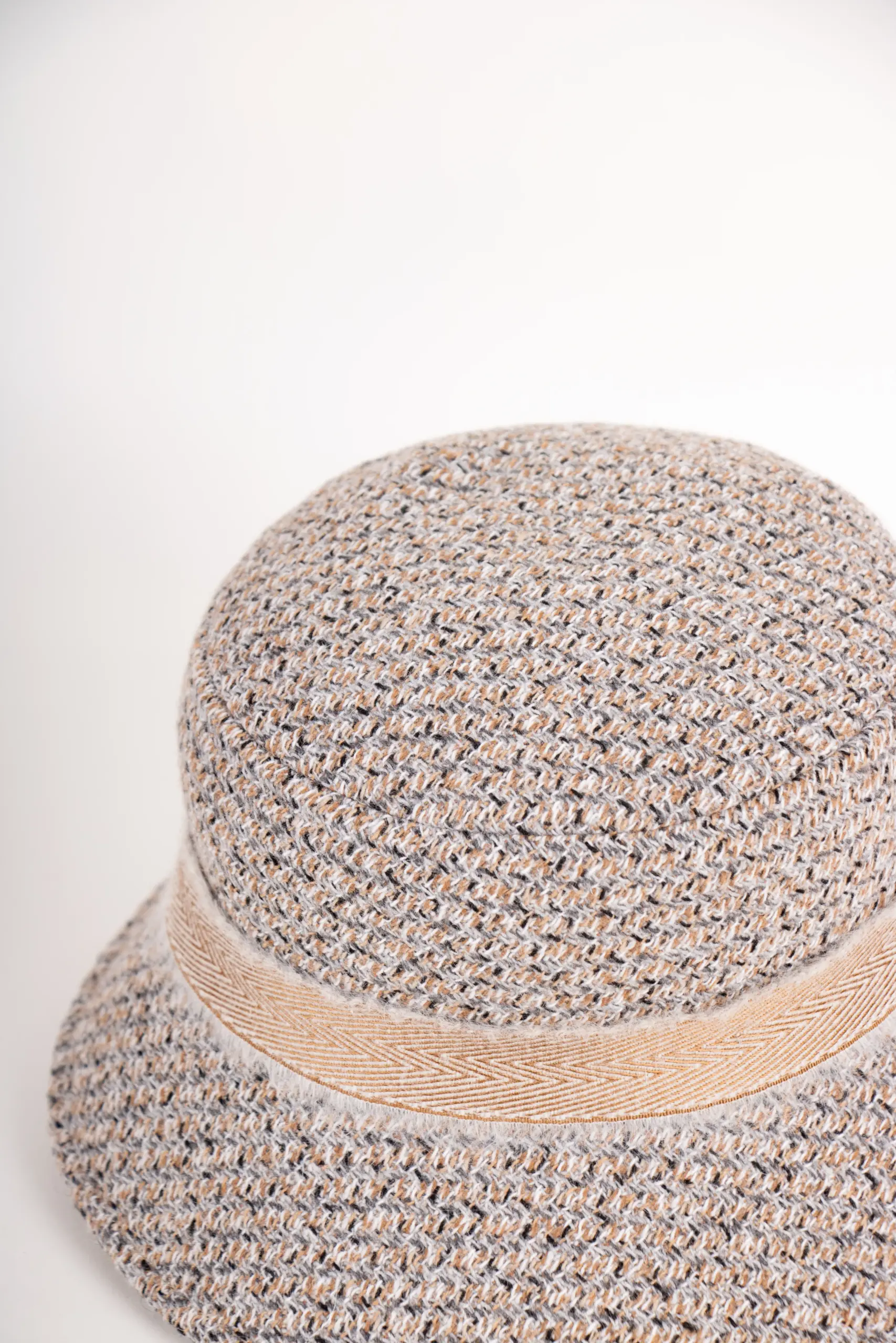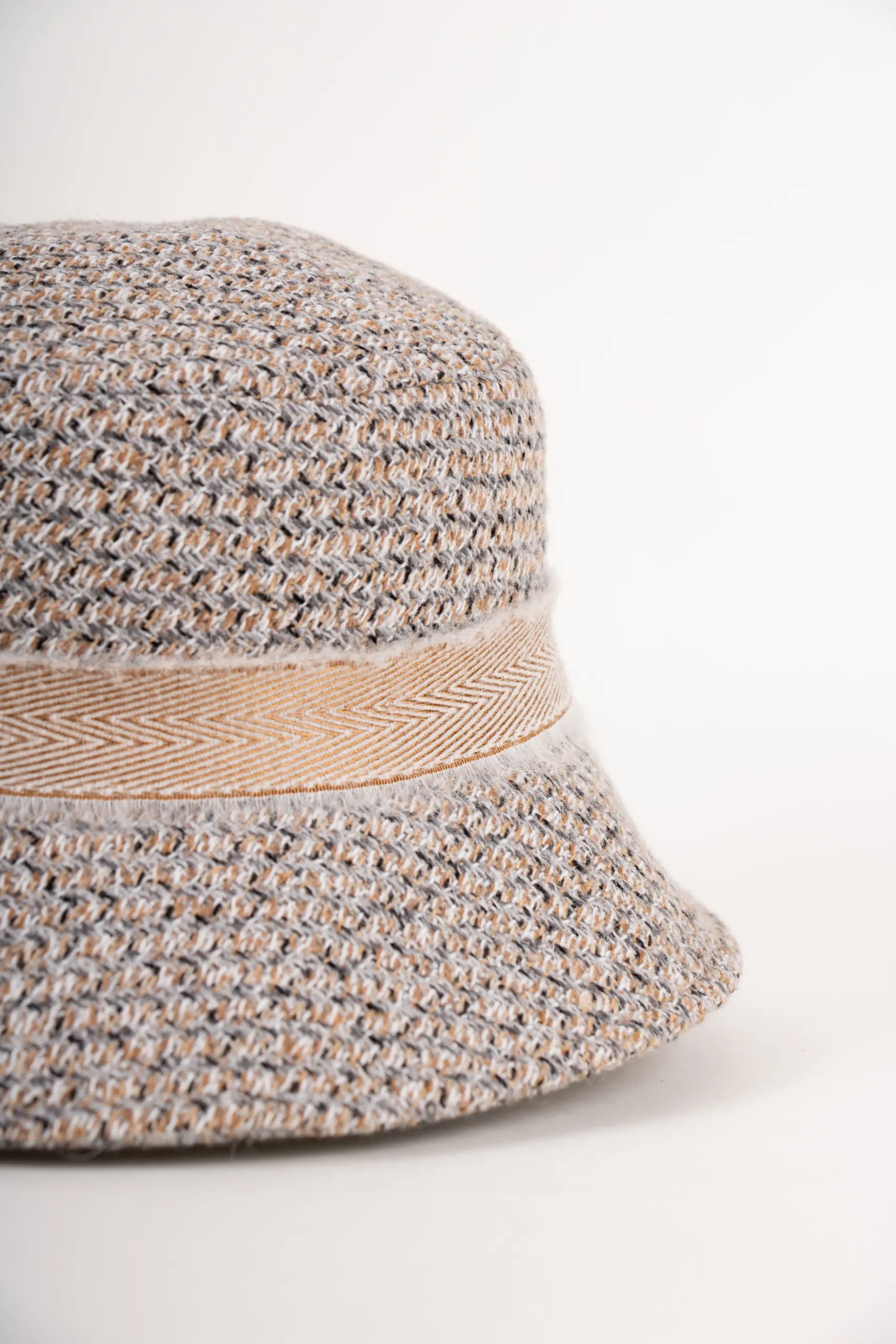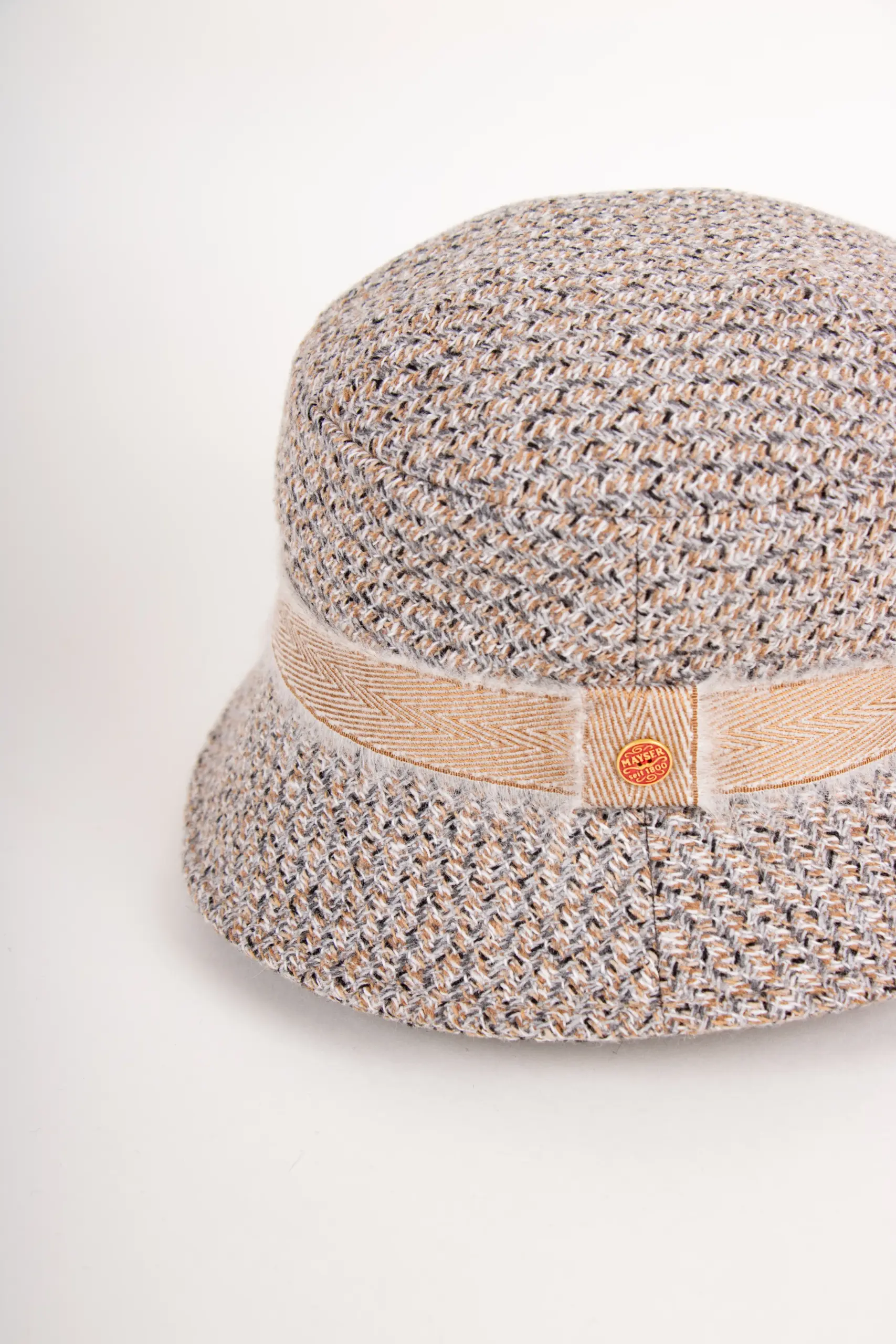 Besonderes Detail: Das dekorative Band im Fischgrat-Design aus goldbeigem Garn und off-whitefarbenem Mohair. Durch die feine, leicht ausgefranste Struktur erhält der Hut einen edlen, zugleich trendbewussten Look – ein kleiner Twist, der den Klassiker aufwertet.