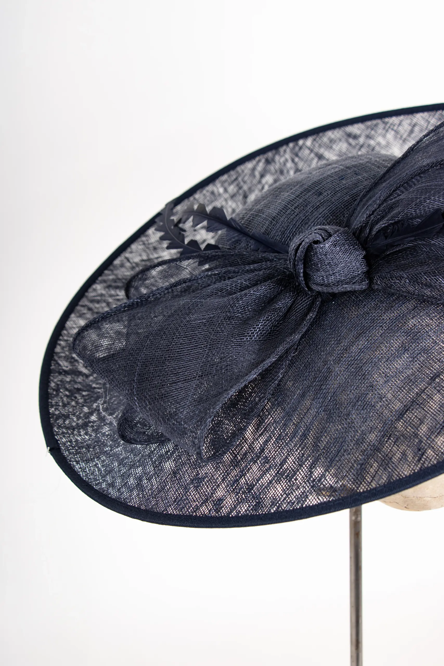 Der flache Saucer-Teller legt sich wie ein eleganter Rahmen um das Gesicht und auf den Kopf. Eine doppelte Schleife und echte Federn setzen eine lebendige, fast schwebende Bewegung – als würde der Hut leise mit Ihnen sprechen, während Sie sich unterhalten, lachen, ein Glas heben. Der Rand ist mit einem farblich abgestimmten Einfass veredelt und gibt dem Design eine klare, couturehafte Linie.