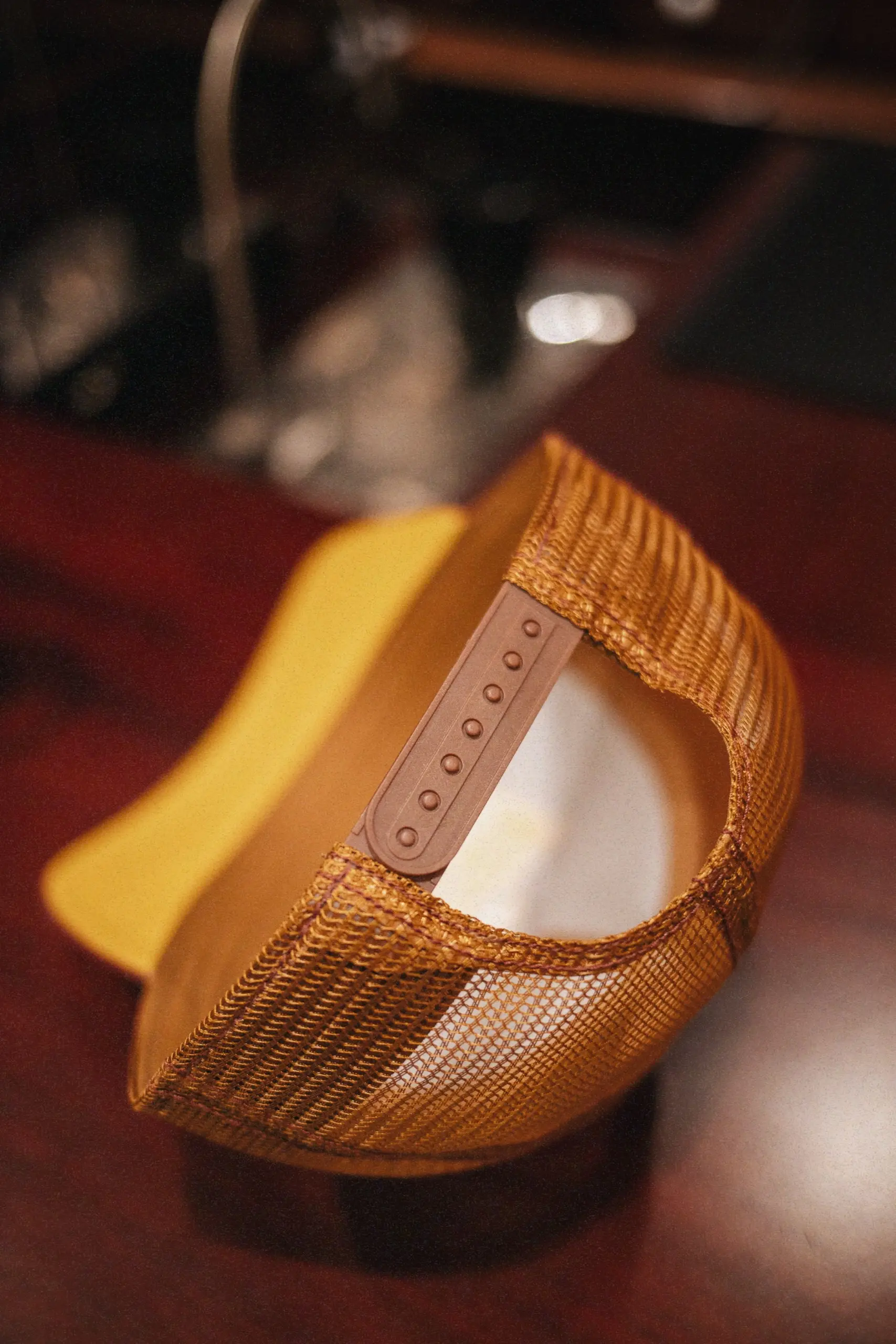 Farbe: Front in Beige mit Patch in Rost-Rot-Gelb, Schirm in Rost-Rot oben (unten Gelb), Mesh in Rost-Orange
