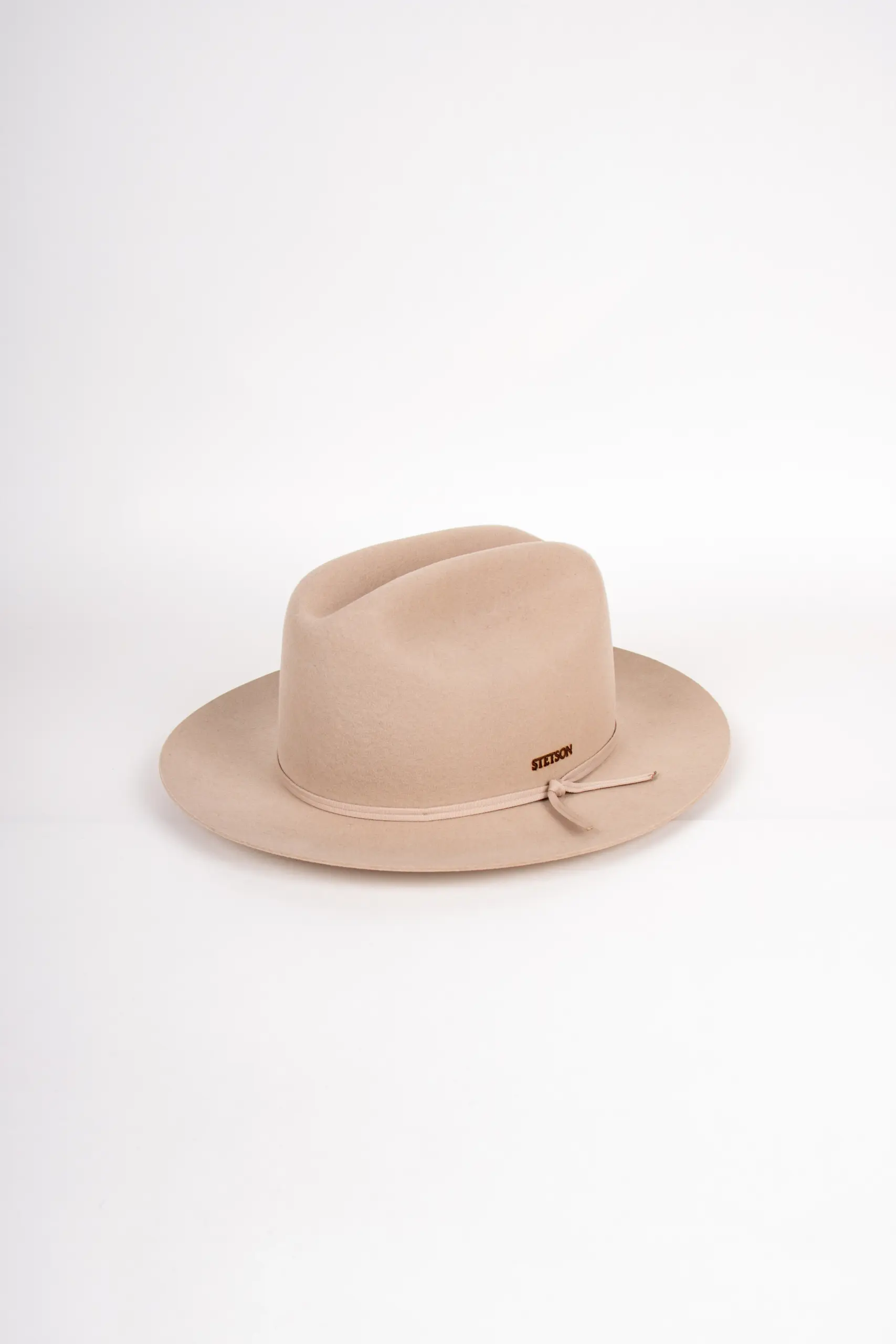 Ein dezentes, angeknotetes Hutband greift die klare Formsprache auf, während das eingebrannte Stetson-Logo an der linken Seite den handwerklichen Charakter unterstreicht. Mit seiner markanten Krone und der leicht geschwungenen Krempe ist der Hut sowohl funktional als auch stilprägend – ein echtes Signature-Piece.