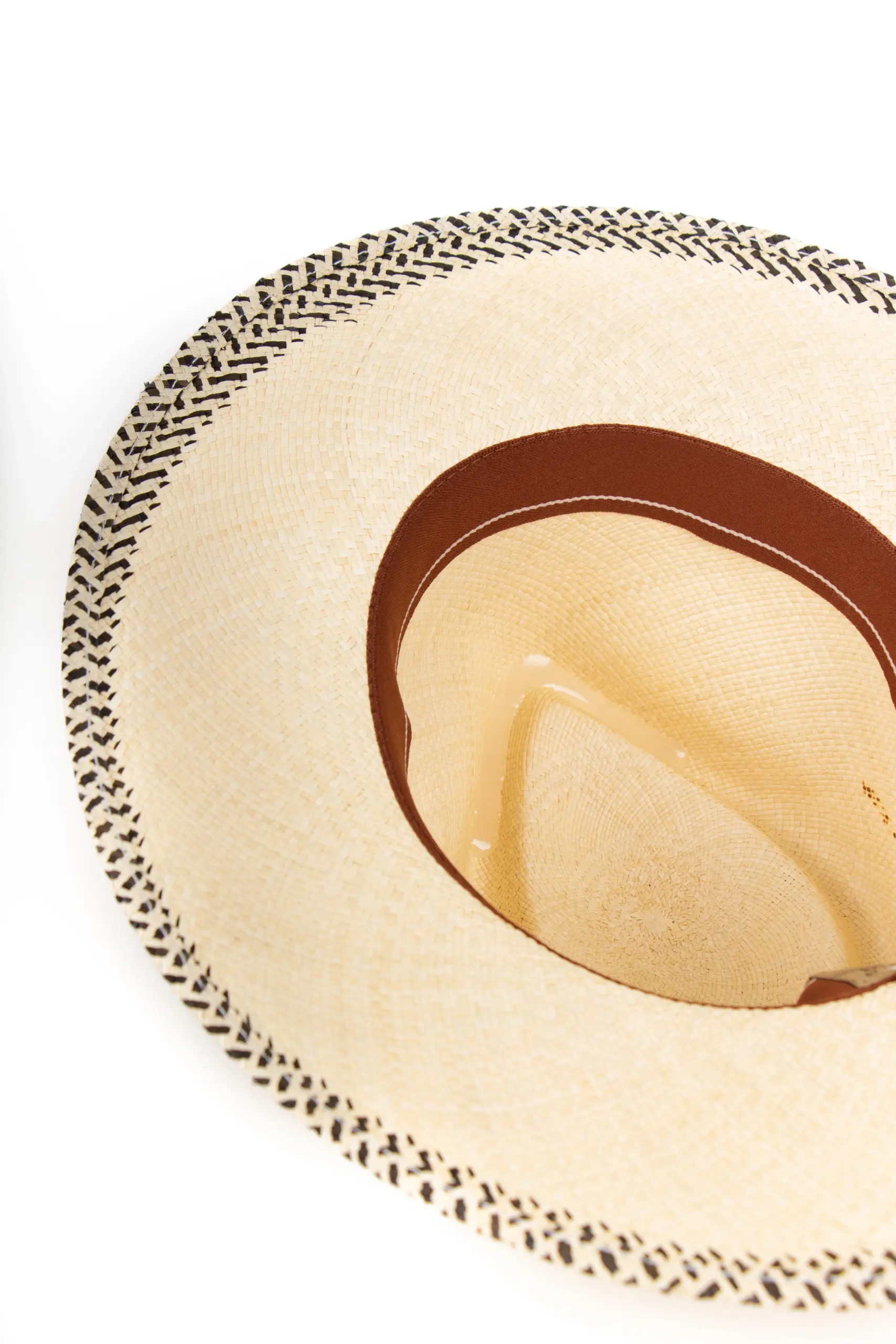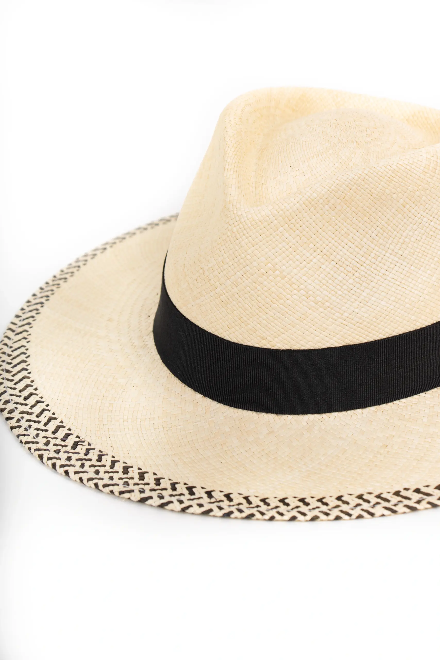 Zickzack-Muster am Rand – von Hand geflochten. Die letzten 2 cm der Krempe sind mit schwarzer Strohfaser durchflochten – das ergibt ein kleines Zickzack-Muster, das wie eine feine Bordüre wirkt. Passend dazu: das schwarze Ripsband um die Krone des Vintimilla Hat. Naturfarbenes Stroh, schwarze Akzente – das ist durchdachtes Design, keine zufällige Dekoration.